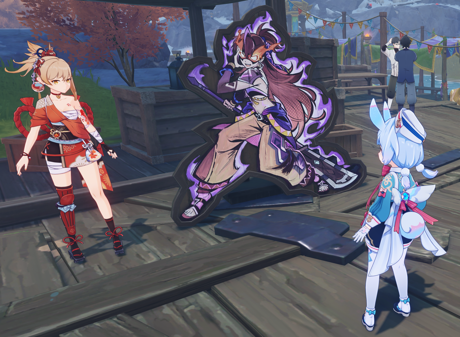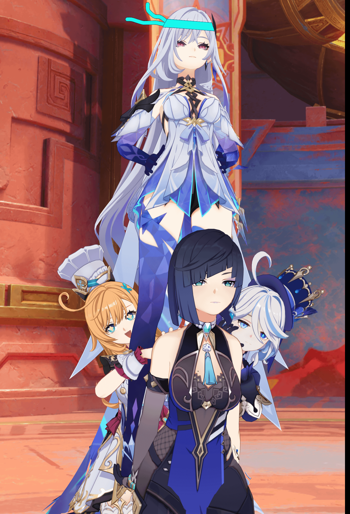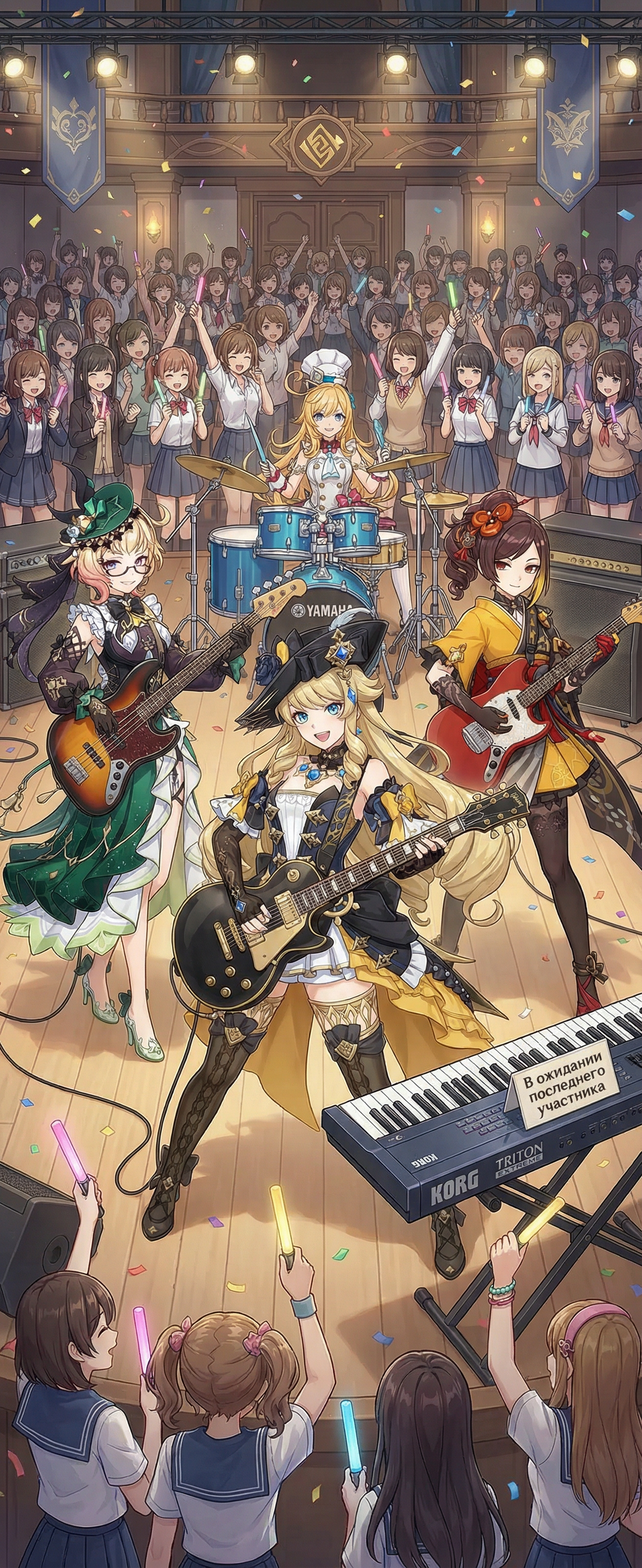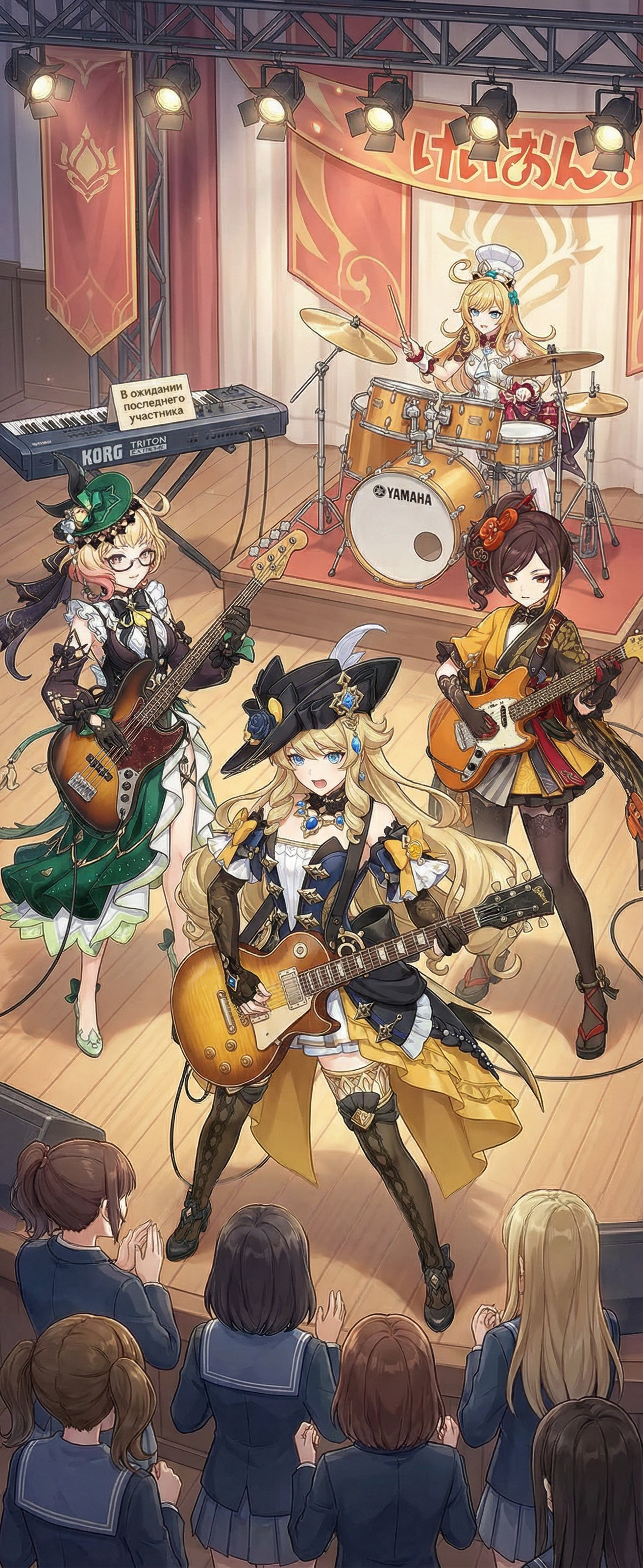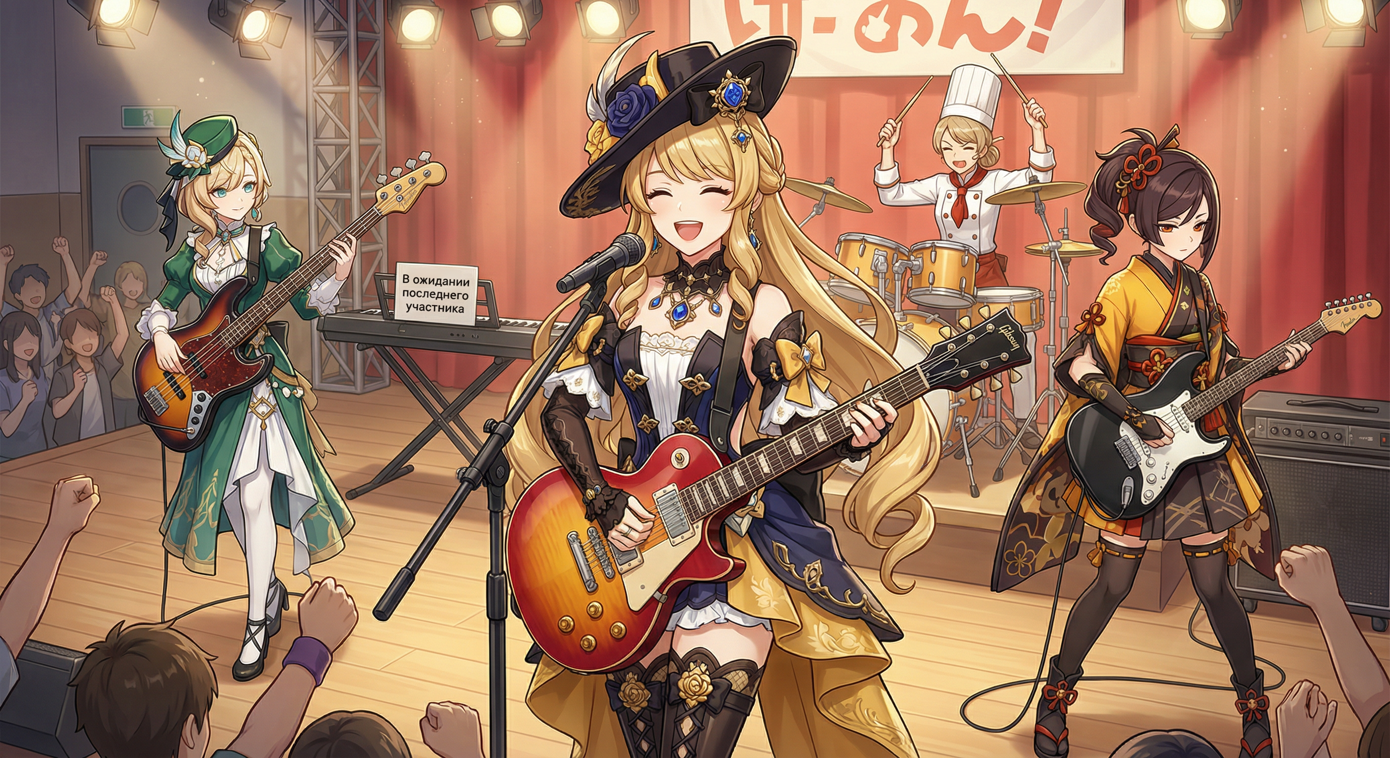 Якобы перерисованная сцена из аниме K-on, где девочки выступают на сцене. Вместо Юи - Навия (Navia from Genshin) из Хоровод импакта. Электрогитара. На переднем плане. Вместо Мио - Эмилия (Emilie from Genshin) из Хоровод импакта. Бас-гитара. Вместо Азусы - Тиори (Chiori from Genshin) из Хоровод импакта. Электрогитара. Вместо Рицу - Эскофье (Escoffier from Genshin) из Хоровод импакта. Ударные. За клавишами вместо участницы табличка "В ожидании последнего участника".