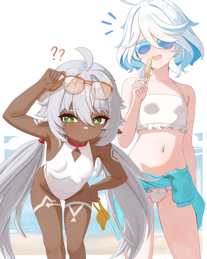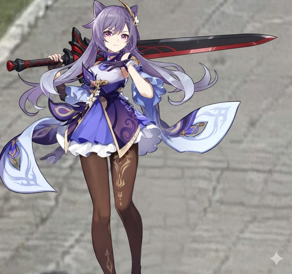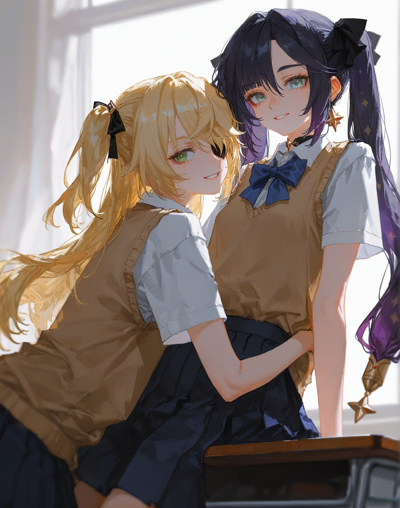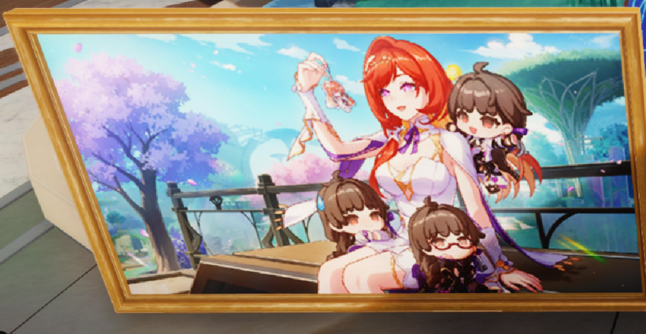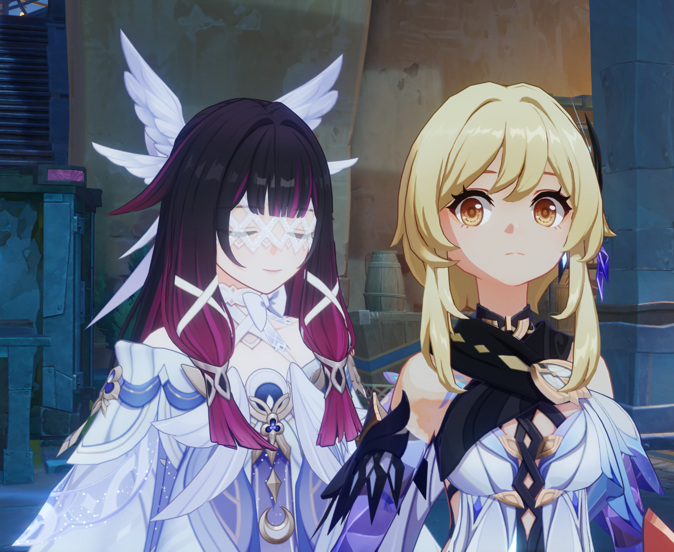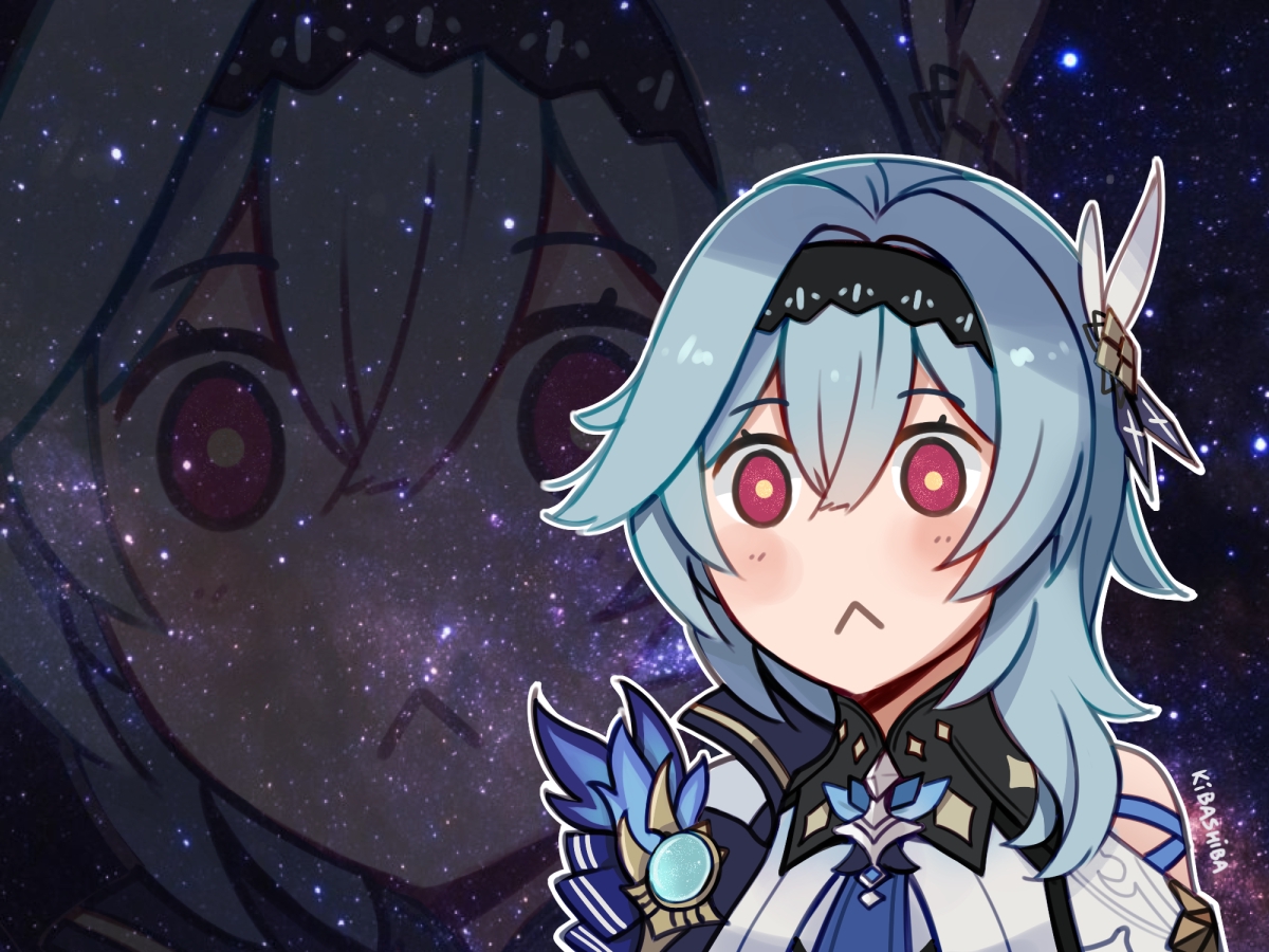 Якобы перерисованная сцена из аниме K-on, где девочки выступают на сцене. Вместо Юи - Навия (Navia from Genshin) из Хоровод импакта. Электрогитара. На переднем плане. Вместо Мио - Эмилия (Emilie from Genshin) из Хоровод импакта. Бас-гитара. Вместо Азусы - Тиори (Chiori from Genshin) из Хоровод импакта. Электрогитара. Вместо Рицу - Эскофье (Escoffier from Genshin) из Хоровод импакта. Ударные. За клавишами вместо участницы табличка "В ожидании последнего участника".