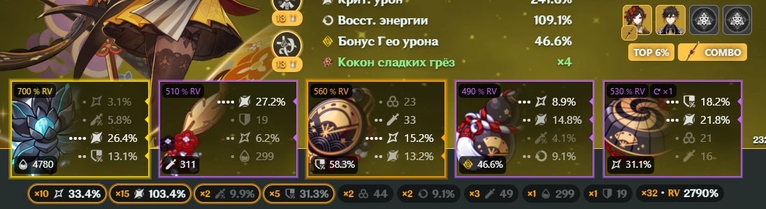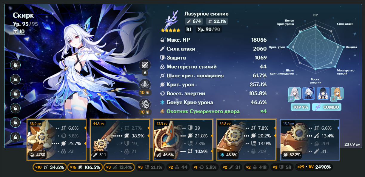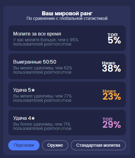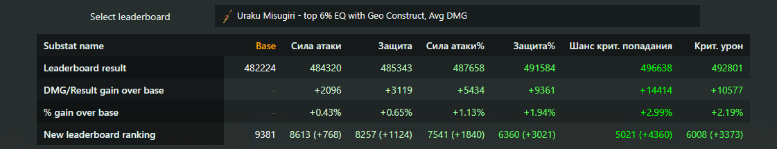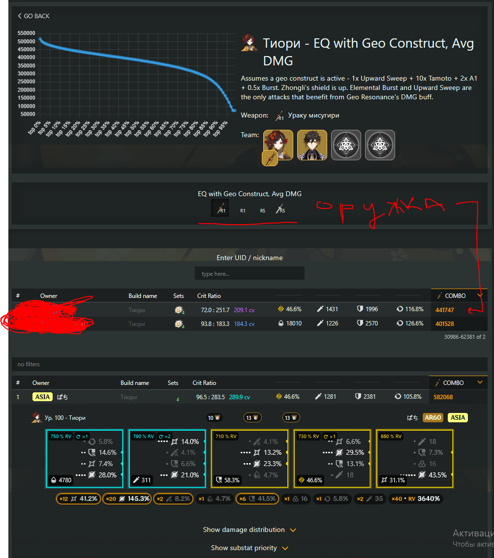 Вы же тут часто про Акашу и рейтинги в ней говорите. Подскажите. Почему только топ-6%? Я не представляю, куда мне и как улучшать результаты. Тут нужны какие-то невероятные четырёхстатовые арты с жирнющими проками, чтобы что-то заменить и улучшить. И это же борьба не за первые позиции, а чтобы хотя бы топ-5% попасть. Почему так? Мне однажды говорили, что это из-за того, что не очень многие выкрутили Тиори с волшебной палочкой. Но все кто выкрутили являются дикими энджоерами героини и потому вложили в неё много сил. От того и конкуренция жёстче. Якобы у популярных героев, где больше загрузок разных сборок, с этим проще.