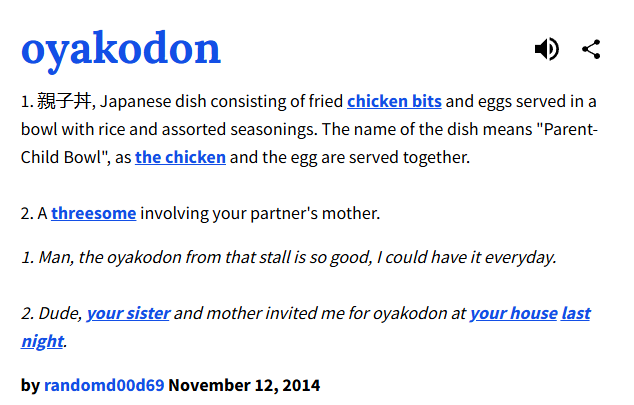 >>6137350 Оякодон — блюдо японской кухни, домбури с омлетом, в которое добавлено куриное мясо без кожи и костей и лук (может включать грибы шиитаке). Название блюда буквально означает «родитель и ребёнок»: под родителем подразумевается курица, а под ребёнком — яйцо.