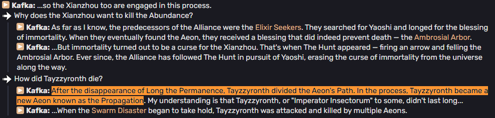 >>5967494 >невероятно длинная Преувеличиваешь. Кому-то надо уполовинить, кому-то наоборот развить и вписать, всех персонажей делать основными - бред. Надо именно по Фаенону с Киреной в первую очередь пройтись и развить, их отношения со златиусами и наше с ними. Про Гисиленсу с Керидрой уже как раз много раз писал, что там произошел реткон и они были частью сквозной более масштабной истории с войной златиусов и заговорщиков. У дани слишком скомкано тоже было, я даже не уловил что произошло потому что всё половину истории описали одной катсценой.