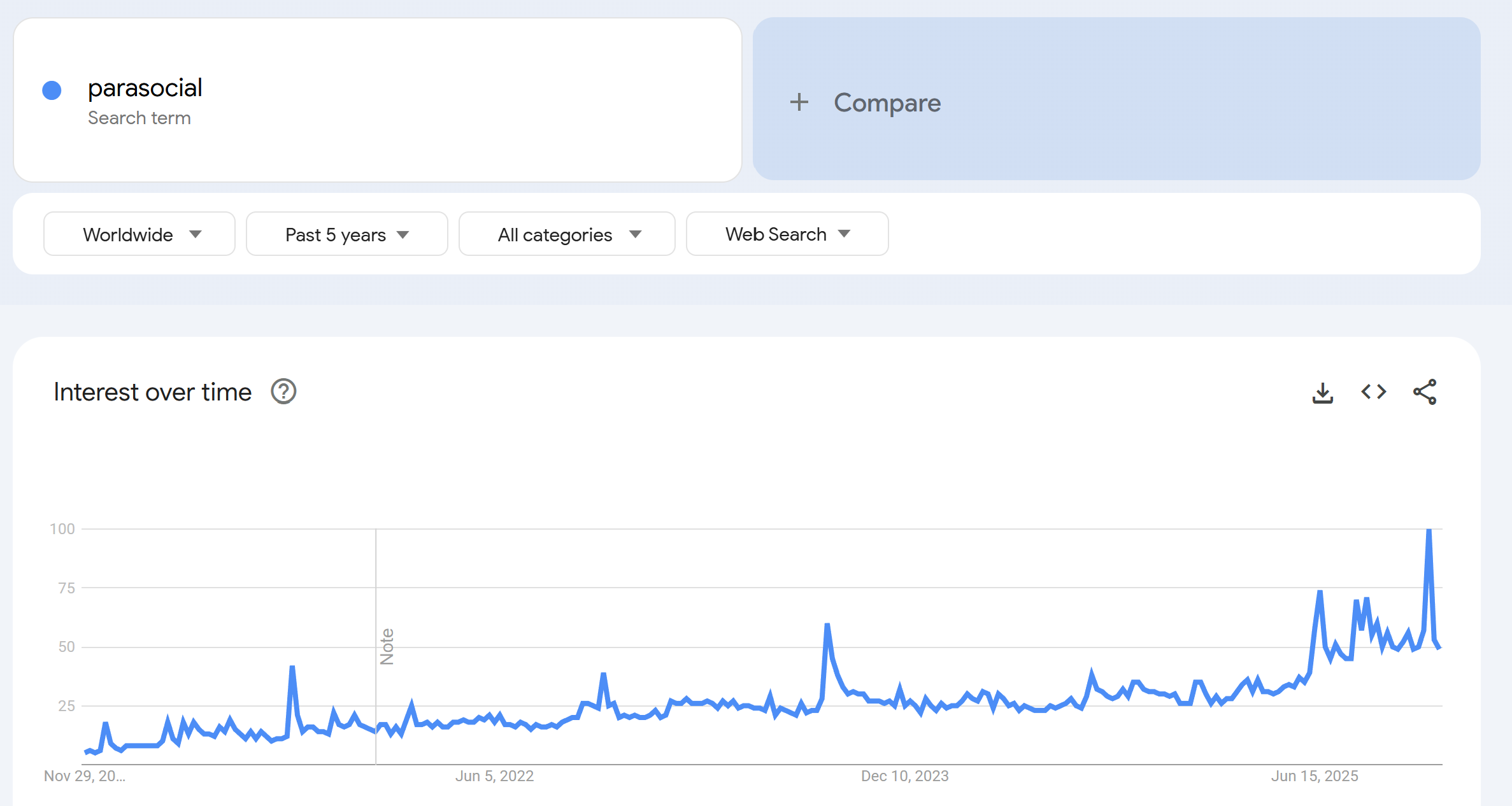 Заметил, что на сойдите, сриттере и прочих западных площадках Кирену вечно хуесосят используя "parasocial". Показалось, что слишком уж потужный форс из неоткуда, никогда такого раньше не было с вайфушками в гачах. Чекунул гугл тренды и оказалось, что сейчас реально какой-то бум с этой хуйней в интернете.