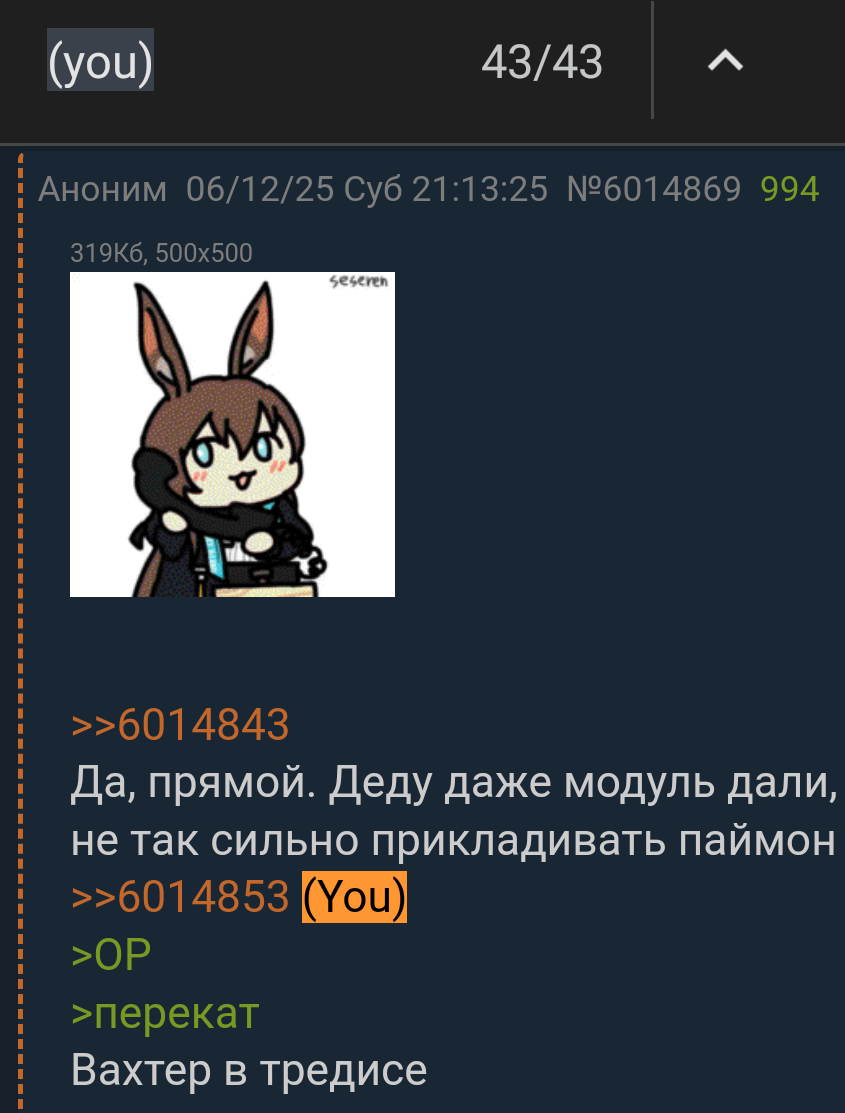 >>6014869 Сначала посмотри какой пиздец был в прошлом треде в шапке, уже лишь потом открывай свои уста для вещания говна (Посмотрел сейчас, твой пост стал 43 который пингует меня непосредственно с этого телефона, вжушк)