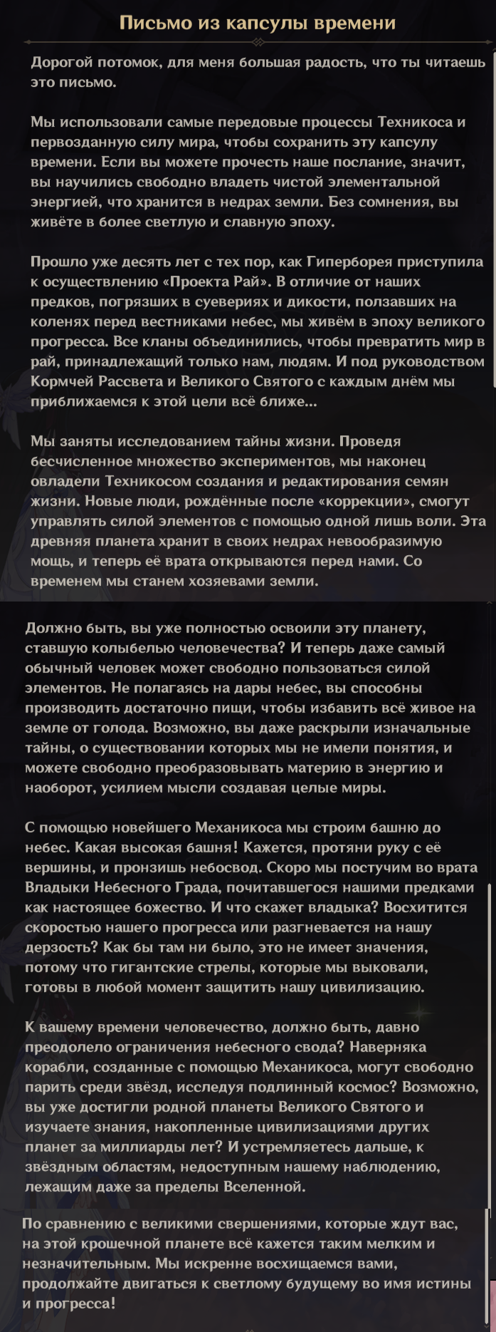 В целом мне квест понравился, хотя мне он почему-то показался чуть ли не самым длинным квестом в истории Геншина, лол. Я по факту с утра сижу, ну ещё правда в треде срал постоянно + перерывы на покуш и покак Единственная претензия к еблану на китайце с его ебучим сюжетным режимом, который нормально ни прервать, ни на паузе не поставить. Пошёл он нахуй с такой реализацией.
