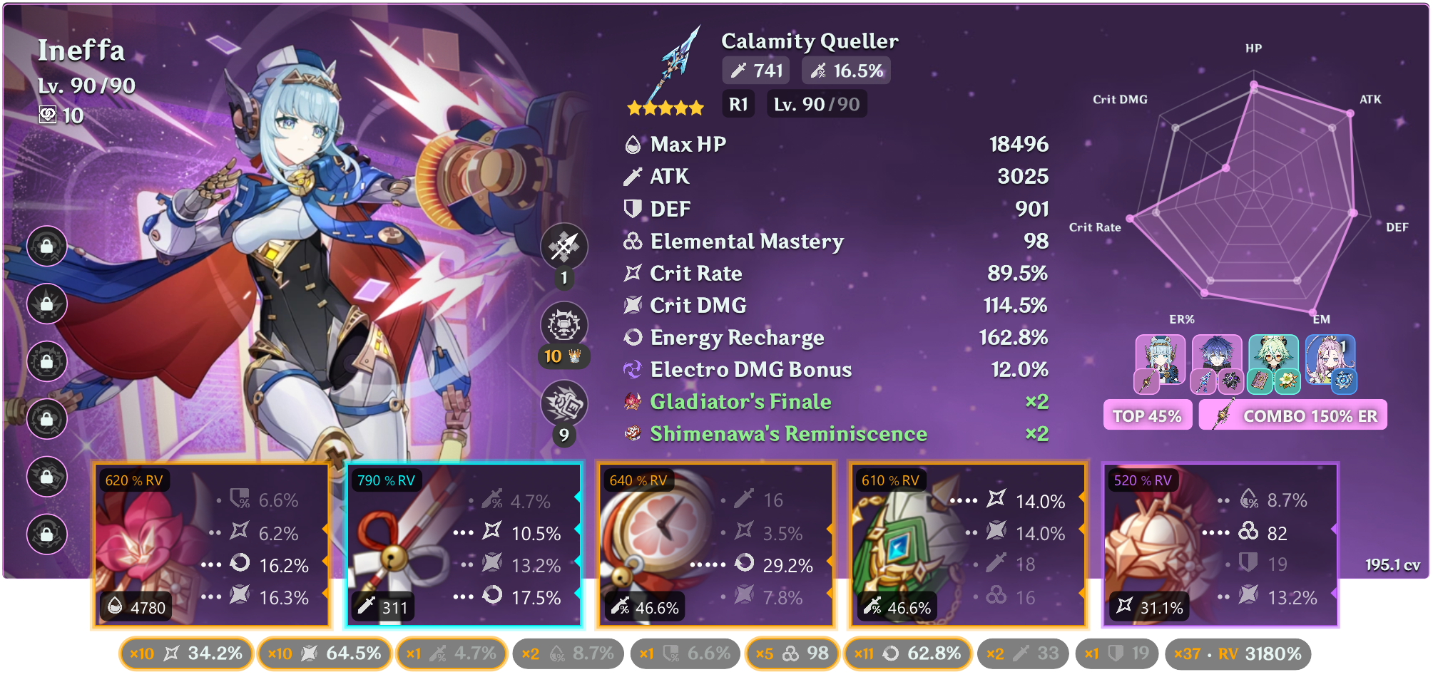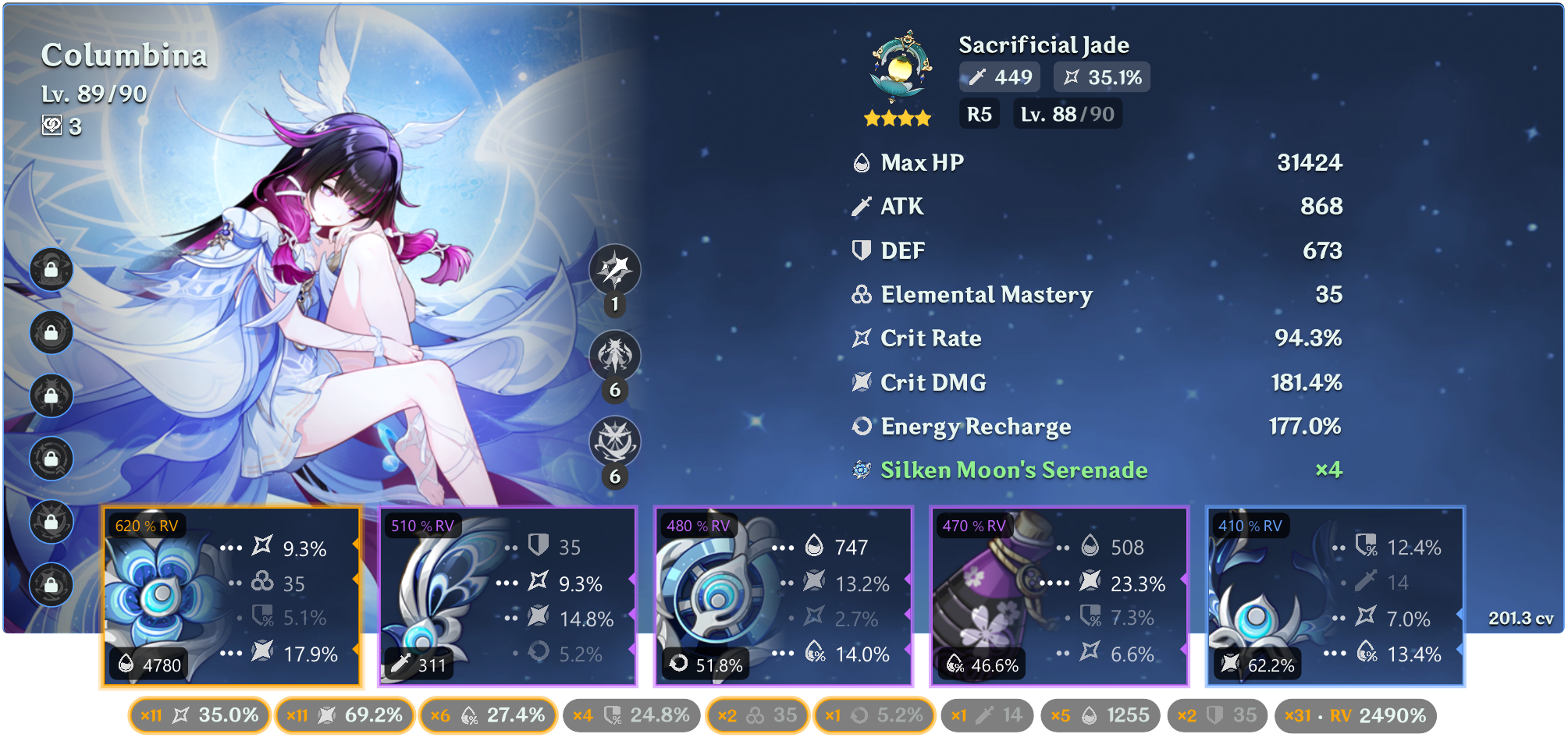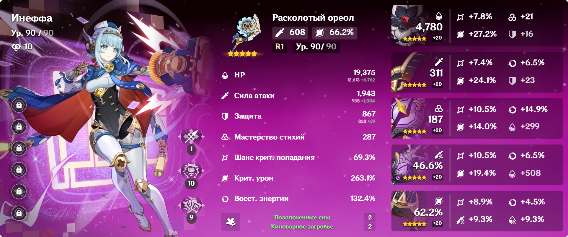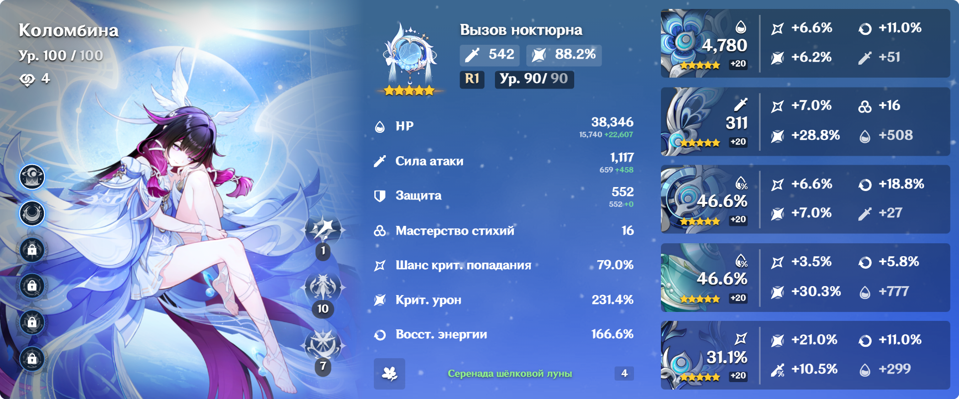 Колумбина: У колумбины +15% крита, у тебя оверкап 10%. Вот стоит оно того - брать бп каталик (да, р5) и с этим пески на речардж? Если у тебя есть каталик на крит урон, то грамотными ротациями + фав на саппортах и можешь обойтись речарджем с сабстатов. А если есть елань (или даже с1) - ещё легче. Скажем, шилонен + елань + колумбина + инеффа, елань на фав и отдаёшь частички колумбине. Тогда ей не нуден речардж, с крит урон каталиком самое то. Билд так себе, но арты недавно вышли, понимаемо.
