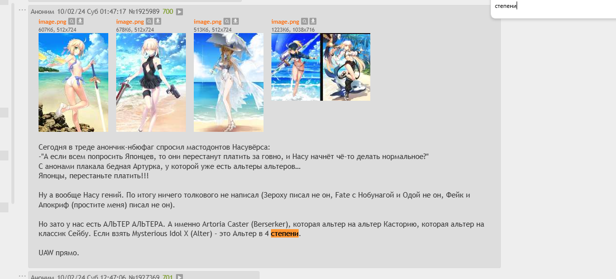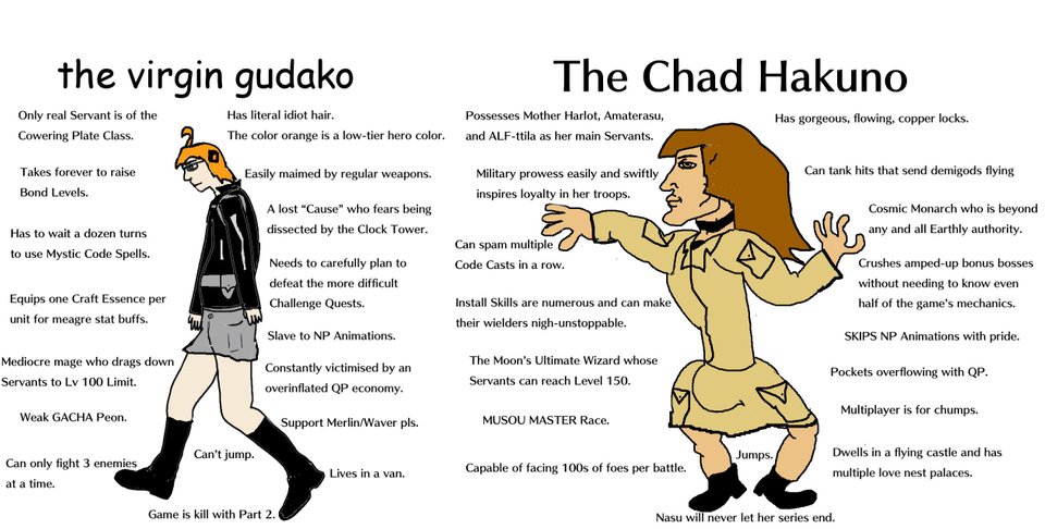Олдфагам привет. Остальным соболезную. Собственно пришел сюда за пояснениями олдов насуверса которые начинали самое крайнее с фсн. Суть такова. Я недавно доломал старенький 4й айфончик и купил андройдик. Ну и решил попробовать фго. Поначалу мне вроде даже понравилось но вот потом у меня возникли вопросы. Но в данном случае спрошу ровно 1 вопрос. По официальной версии фго это канон? А то я чем дальше копаю тем сильнее ахуеваю. Порождение гаи в качесатве слуги, полно каких то левых людей без легенд в виде слуг. Аоко слуга класса "иностранец" к другим новостям, толпа слуг класса иностранец устроили дебошь на главной площади столици. ФМС уже готовит их к депортации. В принципе теперь слугами становятся все подряд бомжи. Наверное поэтому теперь героическим духам которые как говорила Тосака стоят намного выше обычных фамильяров и которых даже волшебники не могут призвать не порвав жопу себе и миру обоссывают скелеты пока не прокачаешь этих бичей. не серьезно, я понимаю что это игровая условность. Но со стороны это смотрится так что выбирая между тактичкой призывников тувинцев и не прокаченными слугами я выберу тувинцев. Призыв слуг это отдельный прикол. Как вообще это возможно? Ну то есть по старому лору там люди рвали анус себе и другим что бы 1 слугу призвать и это чудом считалось. Теперь любой бомж набранный по объявлению может призвать армию атер для альтер. А куда к слову алая смотрит? Там Арая Сорен что бы достичь истока с башней изъебывался дабы алая не спалила и не хрустнула лицо вертушкой за то что посмел законы мира шатать. А тут какие то мимокроки призывают армии вампиров и скачут по времени да по параллельным вселенным творя лютый беспредел. Я просто понять хочу вот это вот все канон или нет? А то я в свое время с экстры охуевал так что слов нет пока мне не пояснили наглядно что это просто спиноф.