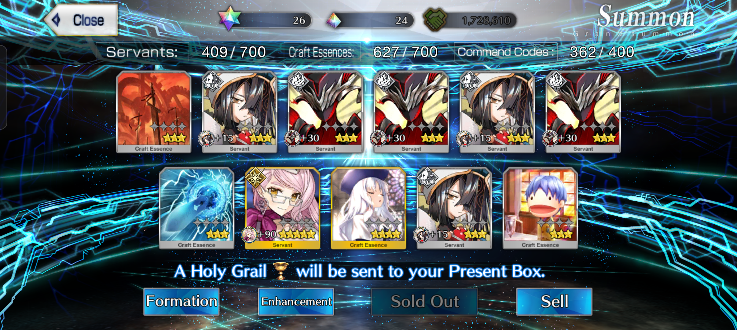 Все, все планы на лето выполнены и перевыполнены. Лолька в своем стиле: пришла нф3, чтобы не отставать от других конкурентов. Плюс в одном из роллов пришли вместе Мордред и Бао, что забавно, так как обе дочери Морганы (а первая Мордред вообще на баннере Морганы выпала). А, ну и первый Немо выпал, наверное пригодится на лотерее.