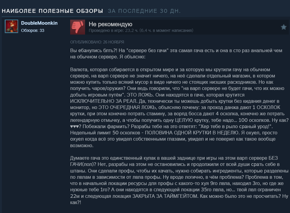 Но как получить чаров/оружия? ИСКЛЮЧИТЕЛЬНО ЗА ДОНАТ. Да, технически ты можешь добыть крутки, но за проход данжа дают 1 ОСКОЛОК крутки и при этом конечно потратив энергию. А чтобы получить ЦЕЛУЮ одну крутку, тебе надо... 100 осколков. Ну как, побежали фармить? Да только недельный лимит 50 осколков - ПОЛОВИНА ОДНОЙ КРУТКИ В НЕДЕЛЮ. Я оxyeл, когда всё это увидел собственными глазами и не поверил как такое вообще возможно.