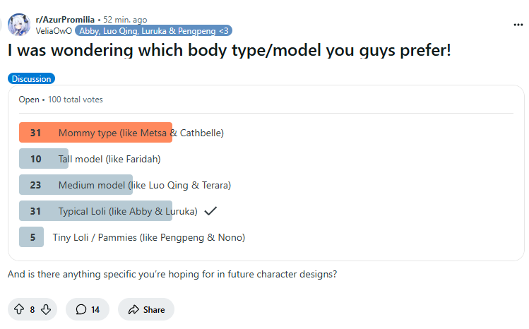 Не понимаю на что рассчитывают разрабы, проводя такие опросы. Очевидно что единственный объективный способ определить, каких персонажей хотят игроки - брать предоплату на конкретный баннер. Но жадное гачаговно не может в настолько прозрачную и честную монетизацию.