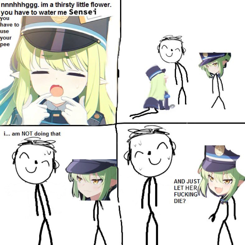 >>4850233 Даже Каёка, которая чилловая и добрая и текёт по кошакам, кошаков же антропоморфных (не)гуманоидов мочит в сортире но по-злому, без удовольствия... И ещё любимая Нагиса сажает на гаубицу любимую Сакураку... Мда уж, куда ни кинь, всюду Клин. Последняя надежда даже хз на кого, на Изуну мб, и то наверняка миморасенганом кому-то палец отоврала.