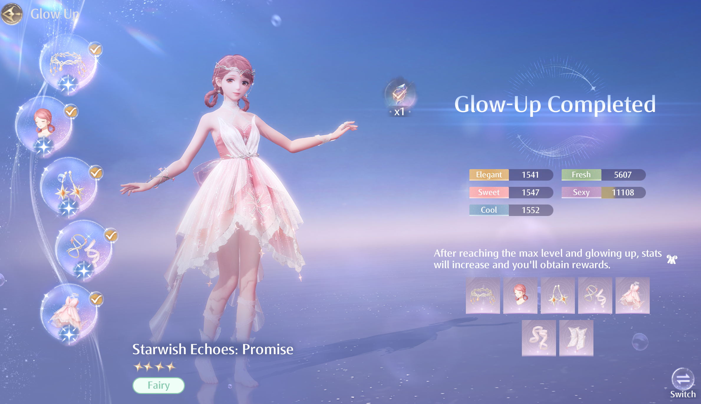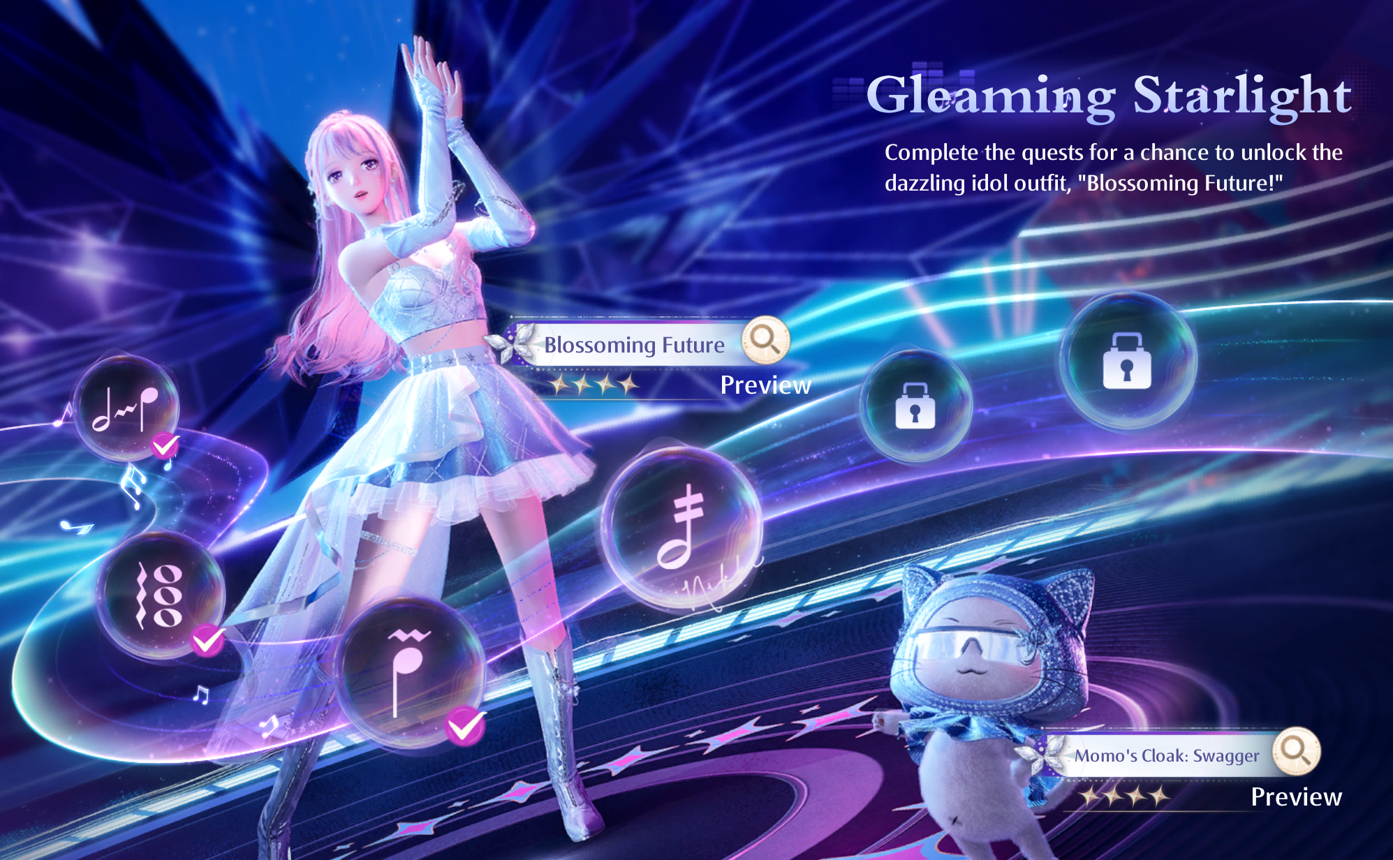4зв награда за ивент - Blossoming Future Основной атрибут: Sweet Как получить Во время события «Сверкающий звездный свет» стилистам будут доступны 6 заданий. Завершение предыдущего открывает следующее. Пройдите их все, чтобы получить награды, включая четырёхзвёздочный наряд [Blossoming Future] и [Плащ Момо: Swagger].