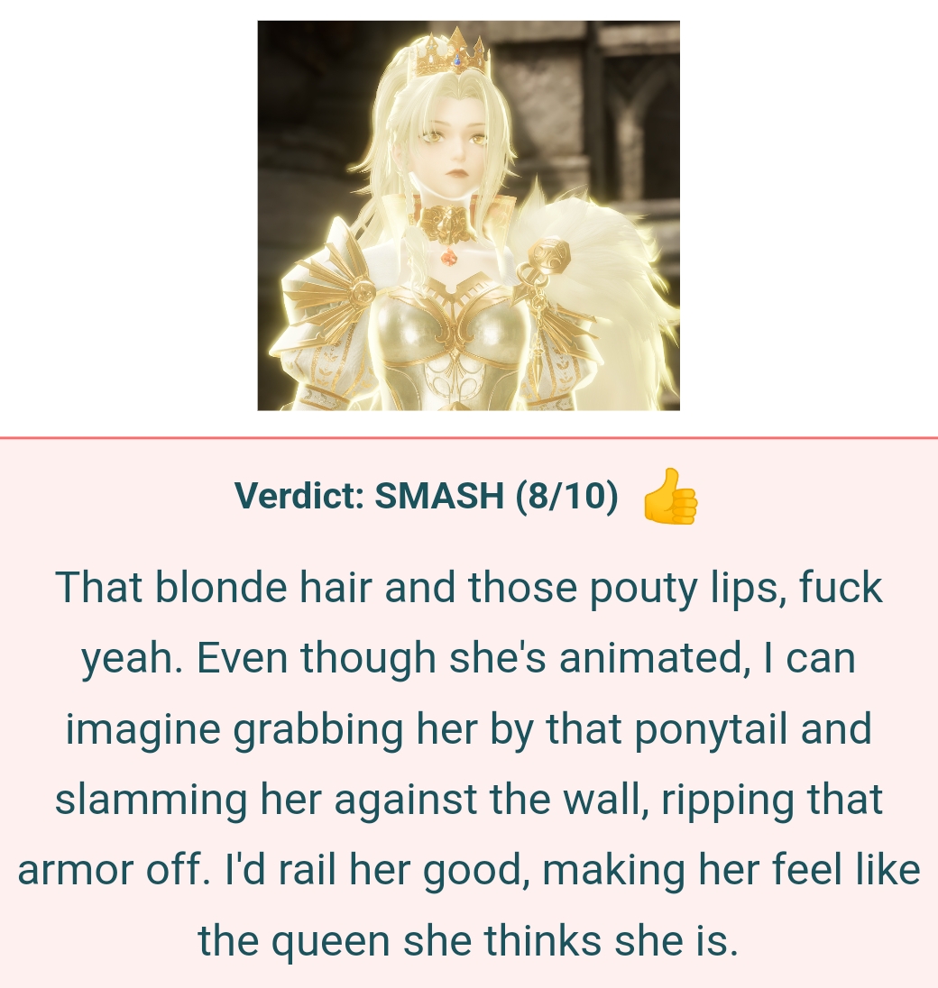 >>5656337 Покрутила до выпадения платья и волос, и 4* хороша. Платья торты достали, это хоть что-то и глоу ап красивый. Даже если следующая невеста темная - там тоже пышное платье и фата. Лучше уж тогда на 2.0 сейвить, будет двойной баннер и они точно постарались для него.