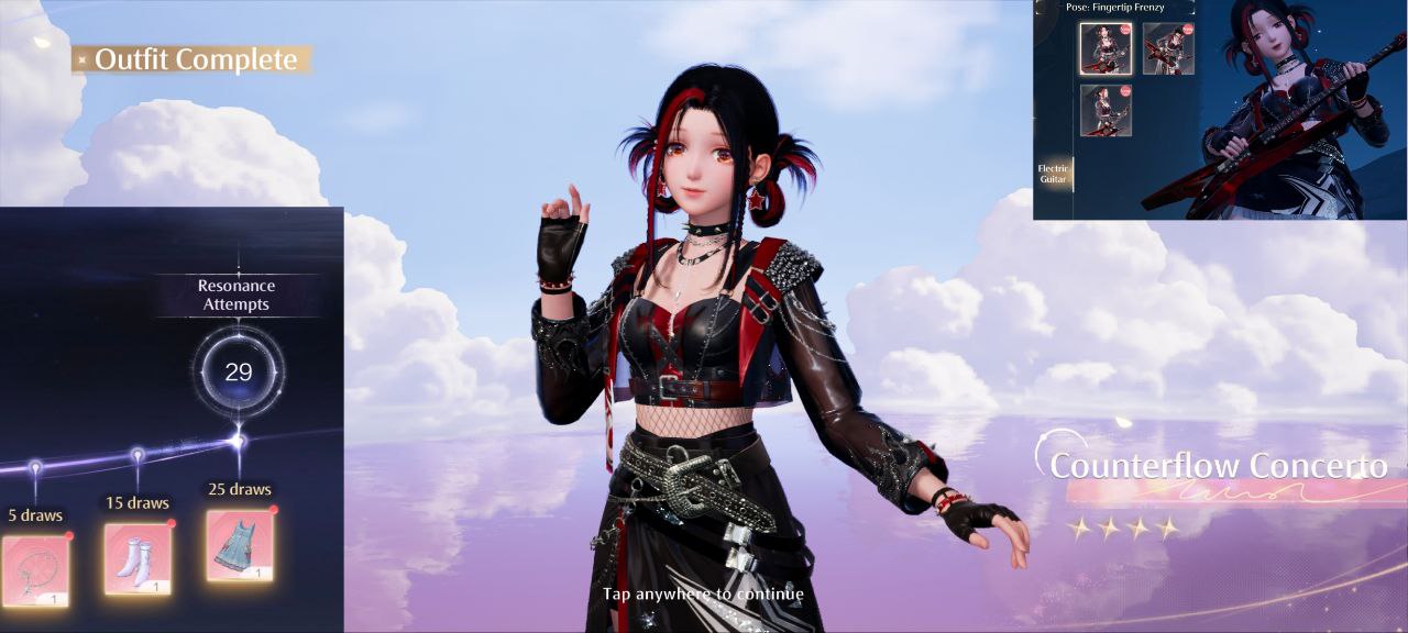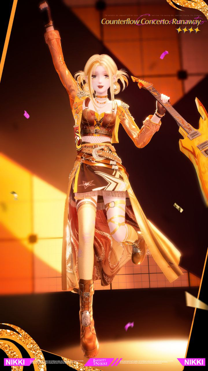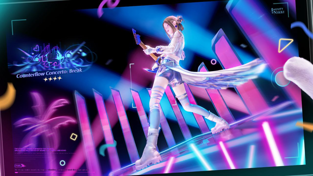 4зв баннер - Counterflow Concerto Основной атрибут: Cool Способность наряда [По умолчанию: Электрогитара]: Струны дрожат под пальцами, высвобождая дикие волны звука, разливающиеся эхом. После активации способности Никки входит в режим выступления. Играй или удерживай разные ноты, чтобы исполнять множество мелодий. Меняй эффекты гитары прямо во время выступления, превращай её музыку и выпускай безудержный музыкальный вихрь за пределами воображения!