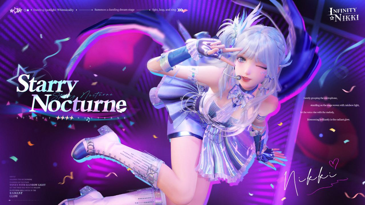 4зв баннер - Starry Nocturne Основной атрибут: Sexy Способность наряда [Ослепительный прожектор: причудливость]: Нежно сжимая микрофон и стоя на сцене, сотканной из радужного света, позволь голосу подняться вместе с мелодией, ярко расцветая в сиянии. После активации способности Никки может вызвать ослепительную сцену мечты. Вращайся, прыгай и пой, пока звук и свет не сольются в грандиозное представление!