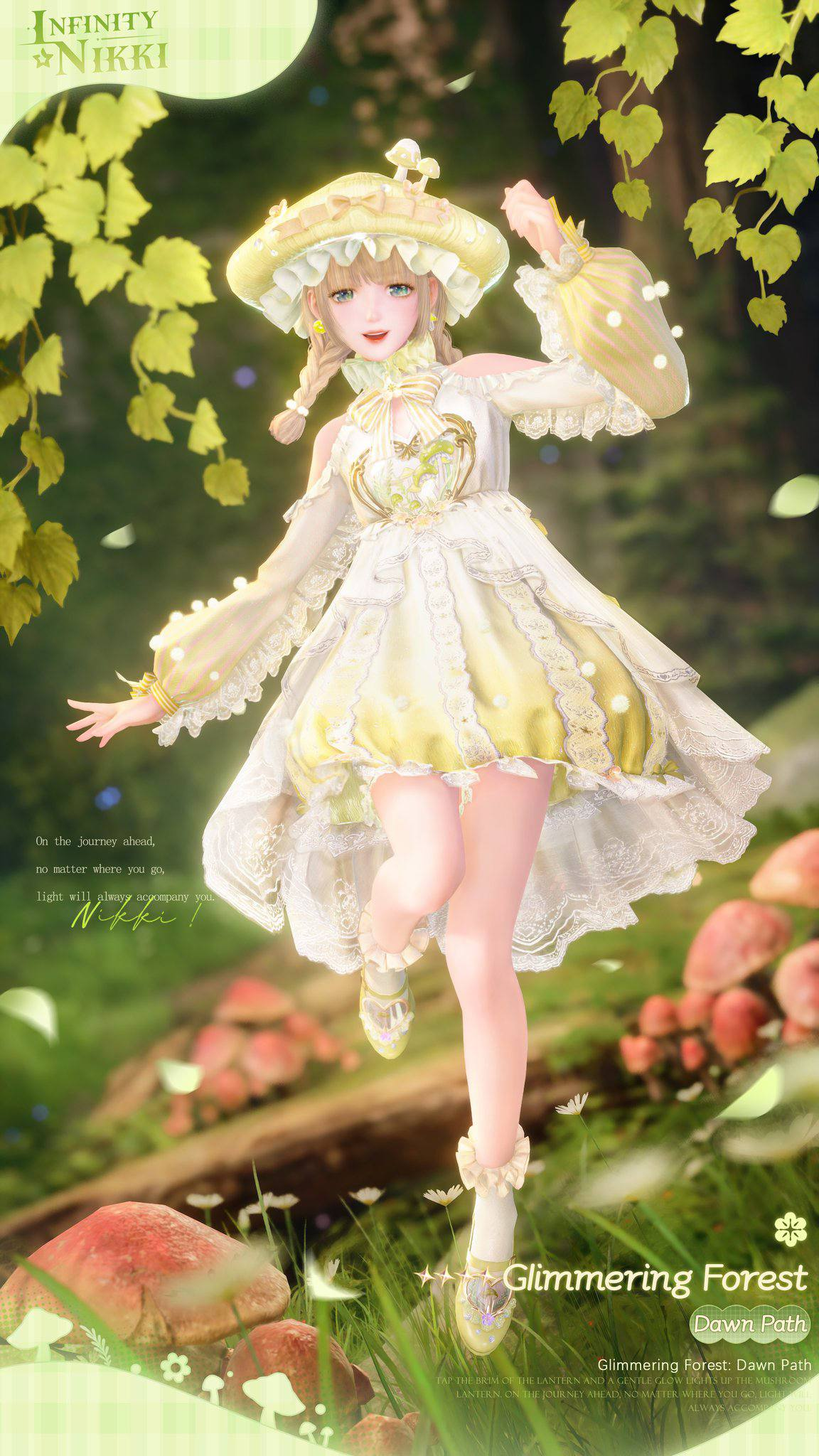 >♾️ Причудливый наряд | Сияющий лес >Основная характеристика: Sweet >Даже красный цвет может дышать мягко — в этот момент он разлился в небольшой купол. Светящиеся споры танцевали на нём, словно звёзды-светлячки, вечно парящие без отдыха. Рядом колыхались два мягких огонька, освещая легенды леса. >🍄 Способность наряда >[Сверкающий гриб: Причудливость] — коснись края фонаря, и мягкое сияние зажжёт грибной светильник. На грядущем пути, куда бы ты ни направилась, свет всегда будет рядом. После активации способности Никки может призвать два мерцающих грибных фонаря. Они покачиваются, сопровождая её, усыпая путь звёздным сиянием, пока она смело шагает навстречу царству грёз.