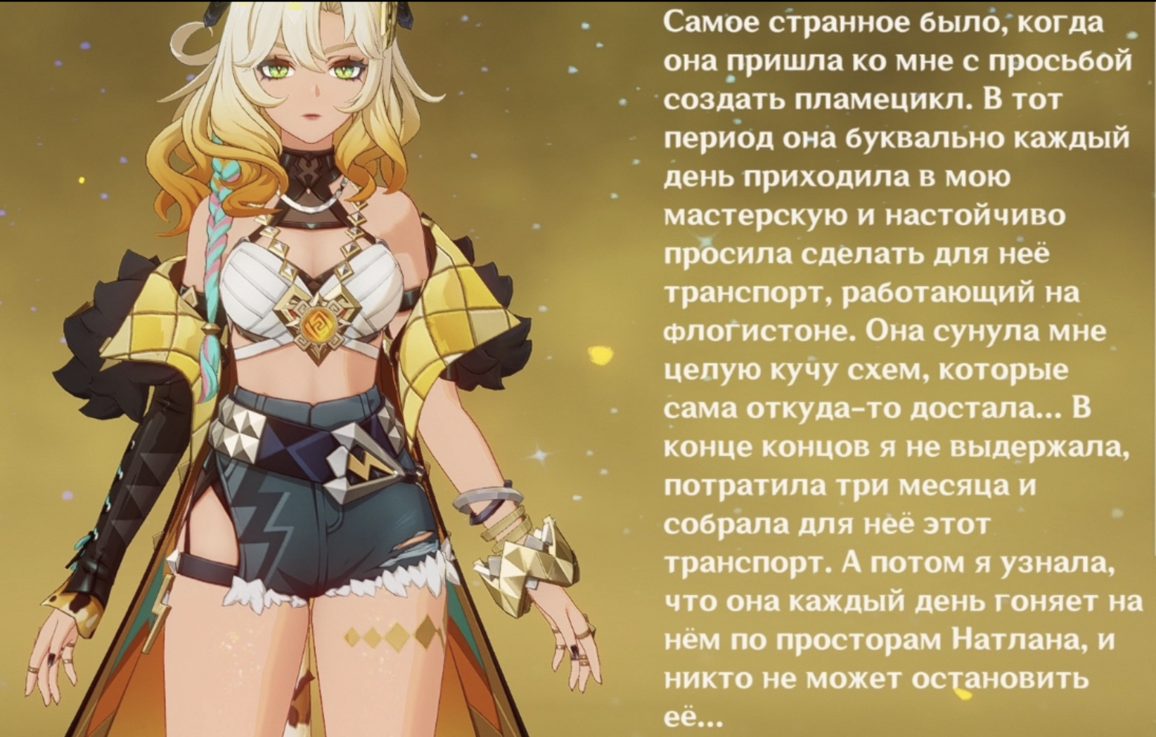 Более того, Ляо настолько похуй на обоснование, что в описании навыков Мявуики мопед называется манифестацией её силы архонта. Вообще не заморачиваются. Начальник сказал спиздить мопед из башни кайфа, дал задание дизайнерам, те нарисовали.