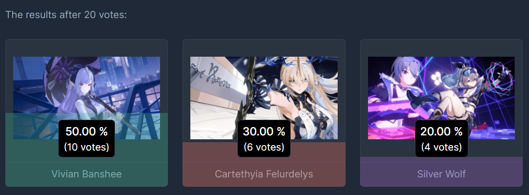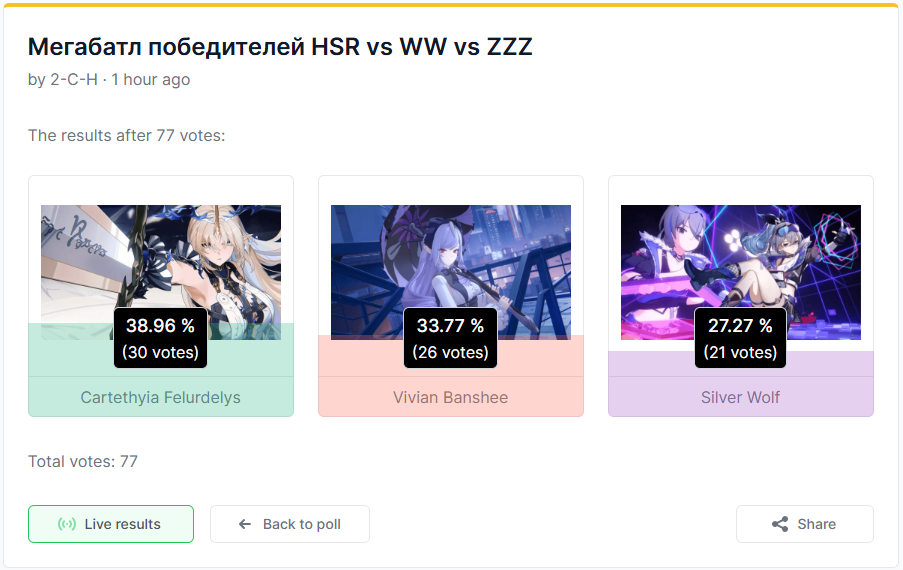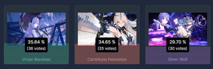 >>5207856 Я не играю ничего кроме ззз, но проголосовал за другую тяночку, хоть и не знаю кто это такие вообще. Просто потому что мне пиздец как не нравится виви.