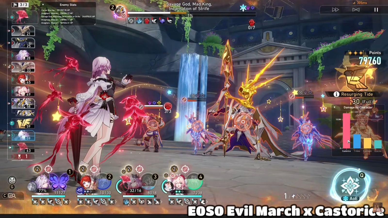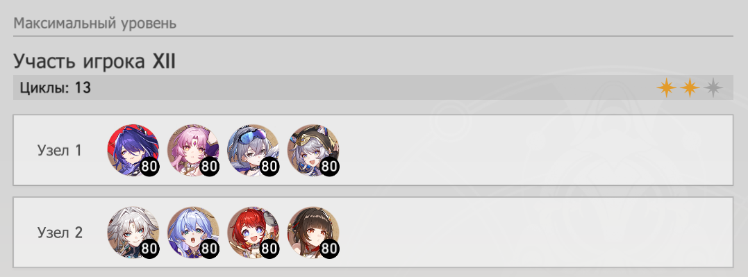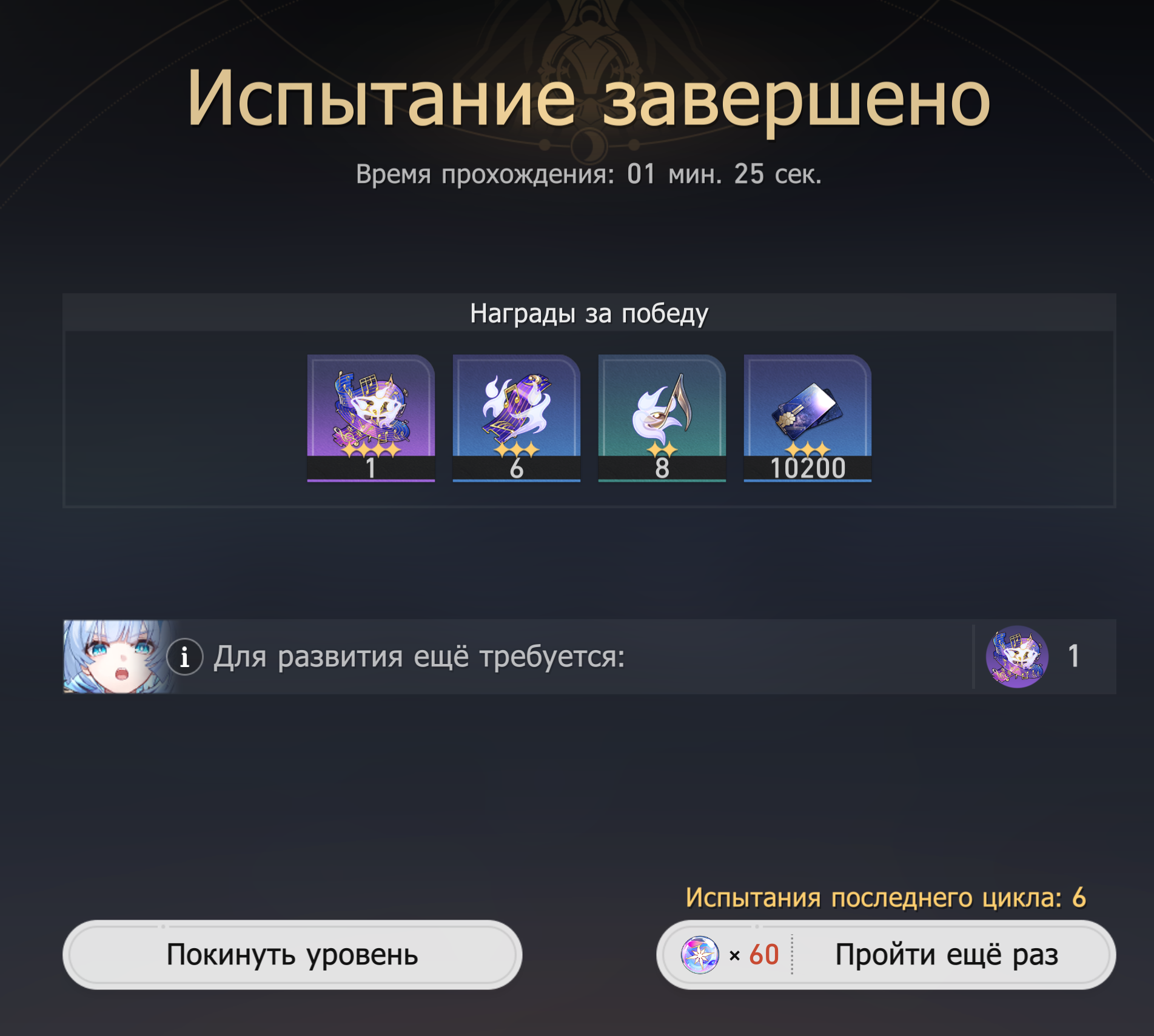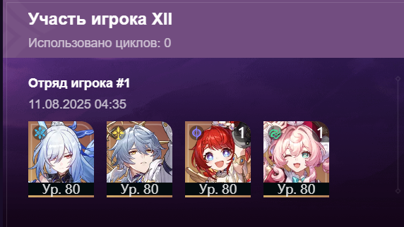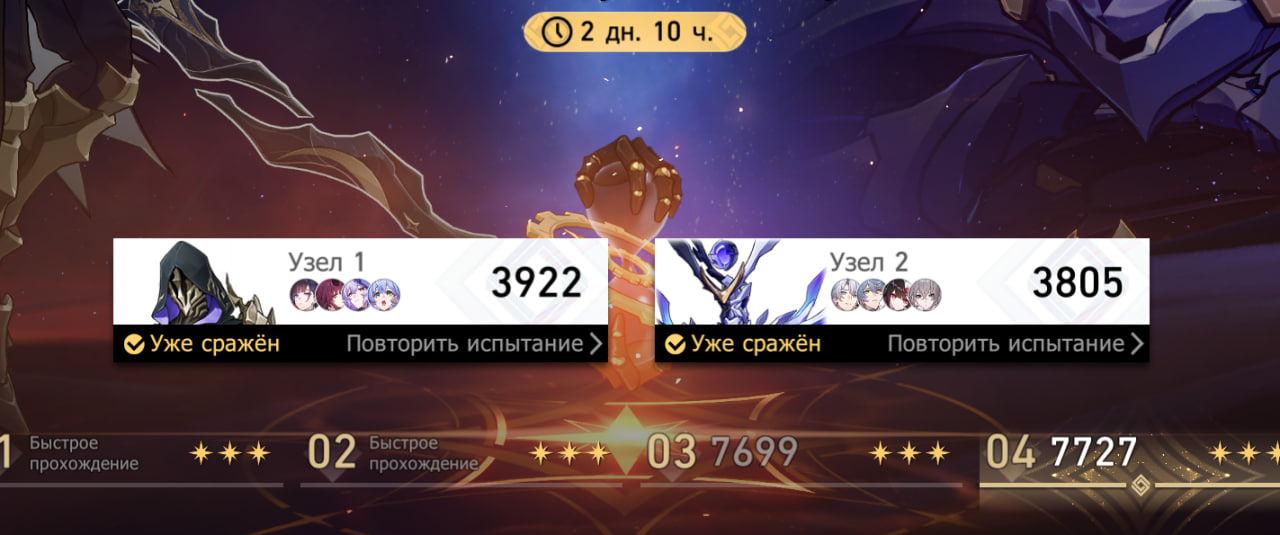 Команда с Фаеноном прошла за 1 цикл, с 26 очками действия в остатке Команда с Касторией прошла за 0 циклов, со 162 очками действия в остатке