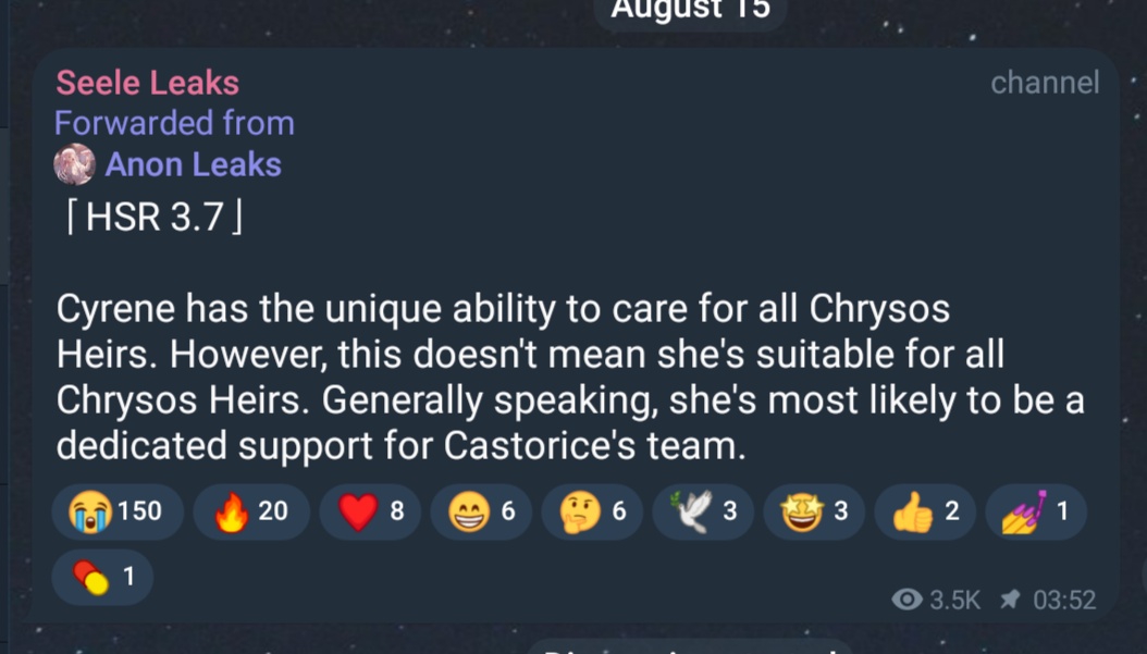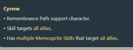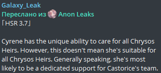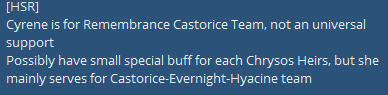Cyrene has the unique ability to care for all Chrysos Heirs. However, this doesn't mean she's suitable for all Chrysos Heirs. Generally speaking, she's most likely to be a dedicated support for Castorice's team.