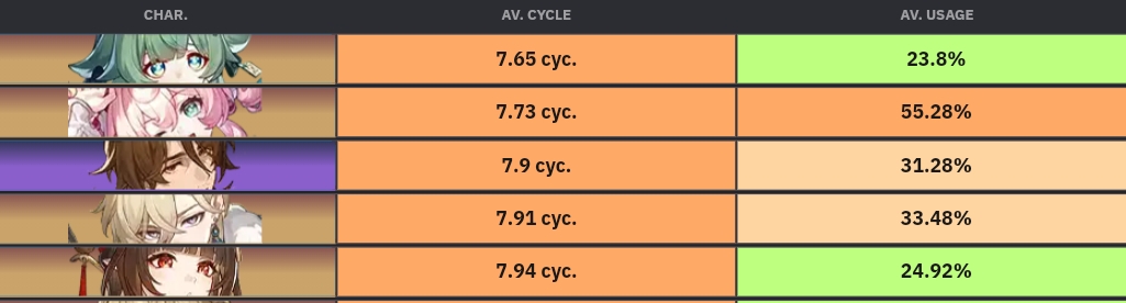 >>5412919 Крутки по одной и той же схеме дают. Сейчас падают, с патча Кирену начнётся рост, достигнув пика в .0-.2 версиях, начав опять постепенное снижение.