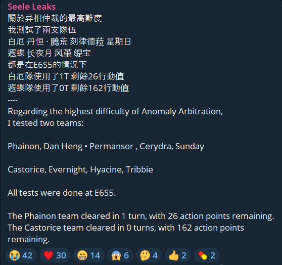 Касательно самого высокого уровня сложности в Аномальном Арбитре, я протестировал две команды: Фаенон, Дань Хэн Сохранения, Керидра, Сандей Кастория, Темень, Гиацина, Трибби Все тесты были проведены на E6S5