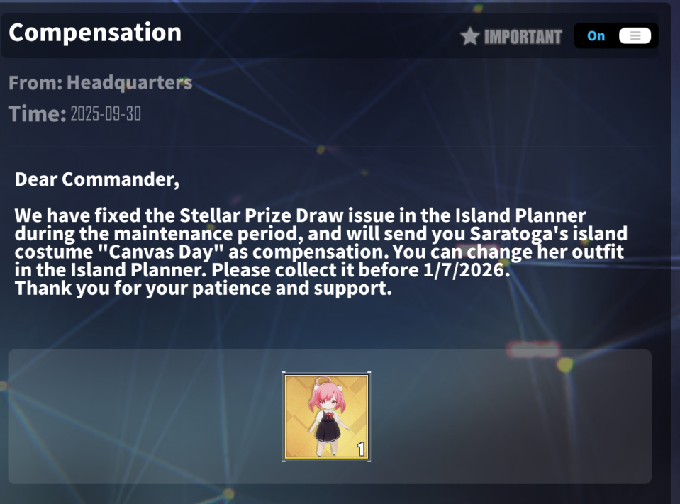 ※Use the Island Authority Permits to give characters the credentials to visit the island freely. ※Unlock more stories, features, and rewards by leveling characters, completing Island Requests, researching, and exploring the island. 【Season】 ※During a season, you can earn Island Development Points (IDP) by doing things such as exchanging resources, producing specific resources, completing transport jobs, participating in seasonal events, and making purchases in the shop. ※Season I will be available between 9/29/2025 – 1/7/2026, 11:59 P.M. (UTC-7). 【Stellar Prize Draw】 ※You can spend Stellar Tickets on the Stellar Prize Draw to draw various prizes, ranging in grade from S (highest) to C (lowest). ※Stellar Tickets can be earned through playing Island Planner, or purchased using Gems. ※The first edition of Stellar Prize Draw will be available between 9/29/2025 – 1/7/2026, 11:59 P.M. (UTC-7). 【Login Bonus】 ※Log in to get great rewards including Island Development Gem, Manufacturing Textbook T2, and Cognitive Chips.