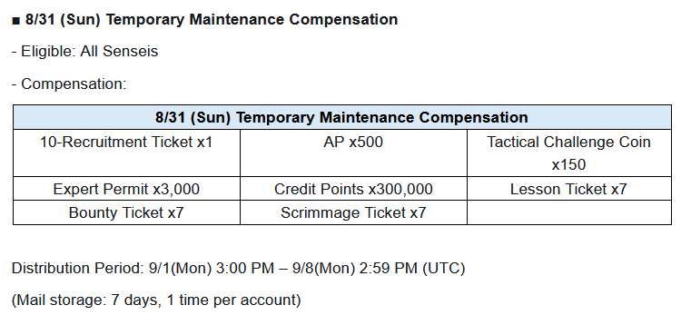 - Schedule: August 31 (Sun), 1:22 PM (UTC) ~ Until further notice - Impact: Game access will be unavailable during the maintenance period - Compensation: TBA - Details: TBA