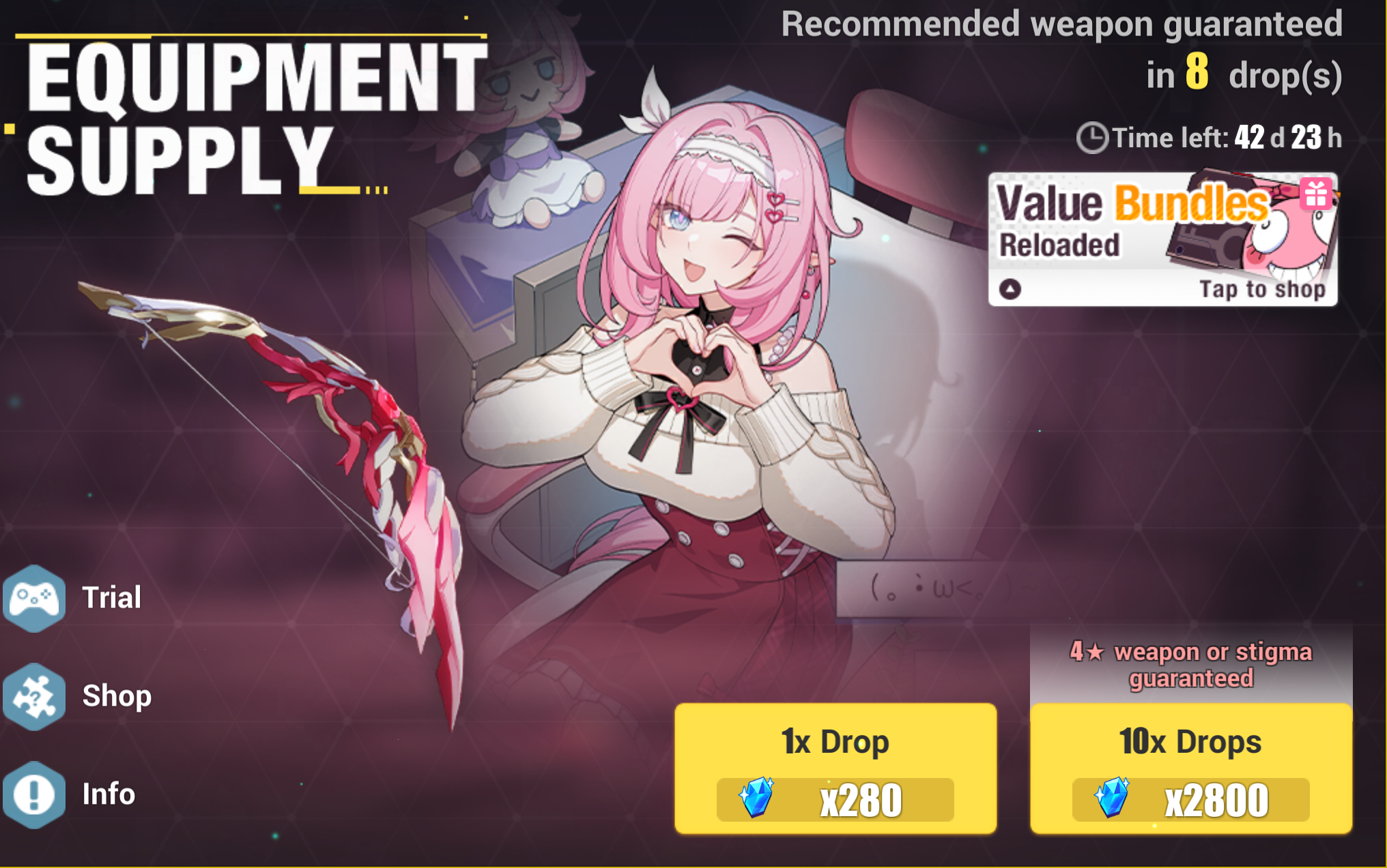 Лул, на радостях от бесплатных пяти карточек покрутил лук Элизии, а не косу. Игра обрадовалась моей легкомысленности и сэкономила мне две крутки до гаранта. Чтож 16 дней осталось, посмотрим что дадут.