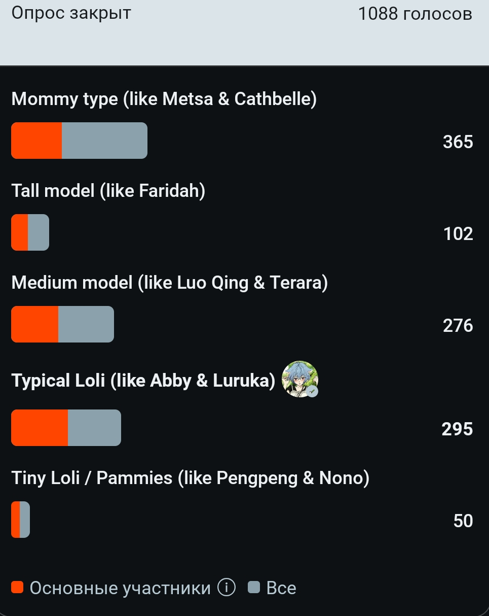 >>5550124 Всратый опросник, Луруку можно и к средним отнести и к лоли. Но даже так тут за бимб проголосовали ~33%, а за Луруку и лолей ~27% - довольно близко.