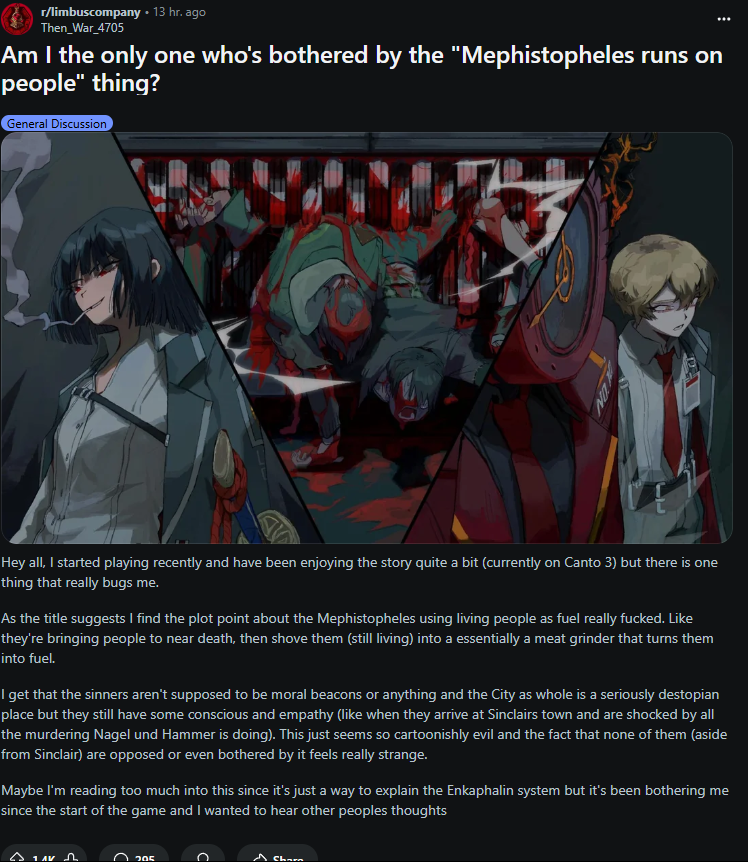Я теперь понимаю, почему тут Джихуя хейтят. Пока для него и западной сои Лимбус Компане вся такая "мрачная" и "жестокая", мне лично нужно выйти за дверь хаты, чтобы в Городе оказаться.