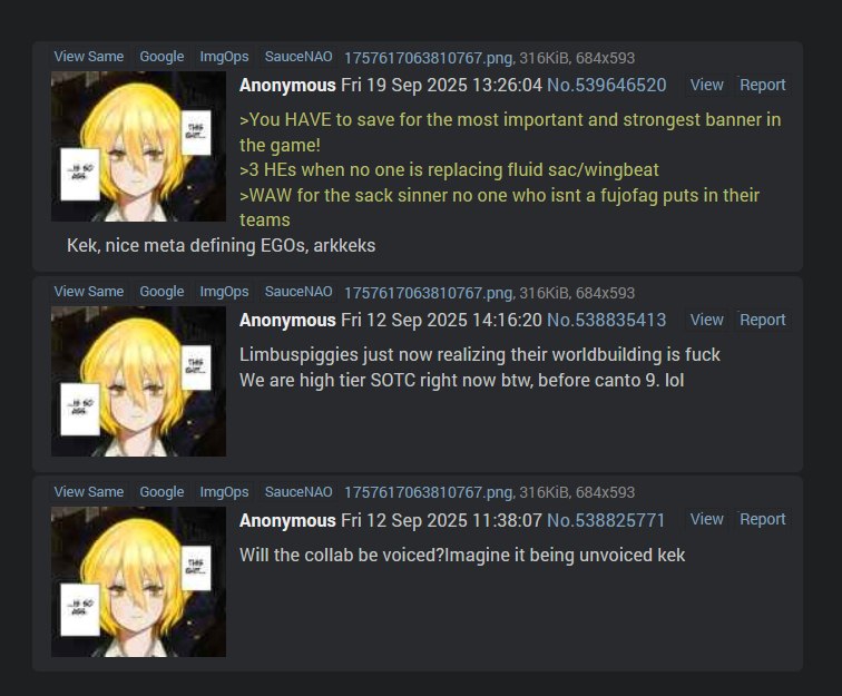 Как же похуй на каллаб, вы бы знали. Обычно в гачах какой-то интерес вызывают, а тут... похуй. В плане круток, в смысле. Ну нет желания крутить ебаные эго, хоть усрись. Лучше на вальпургу подкоплю.