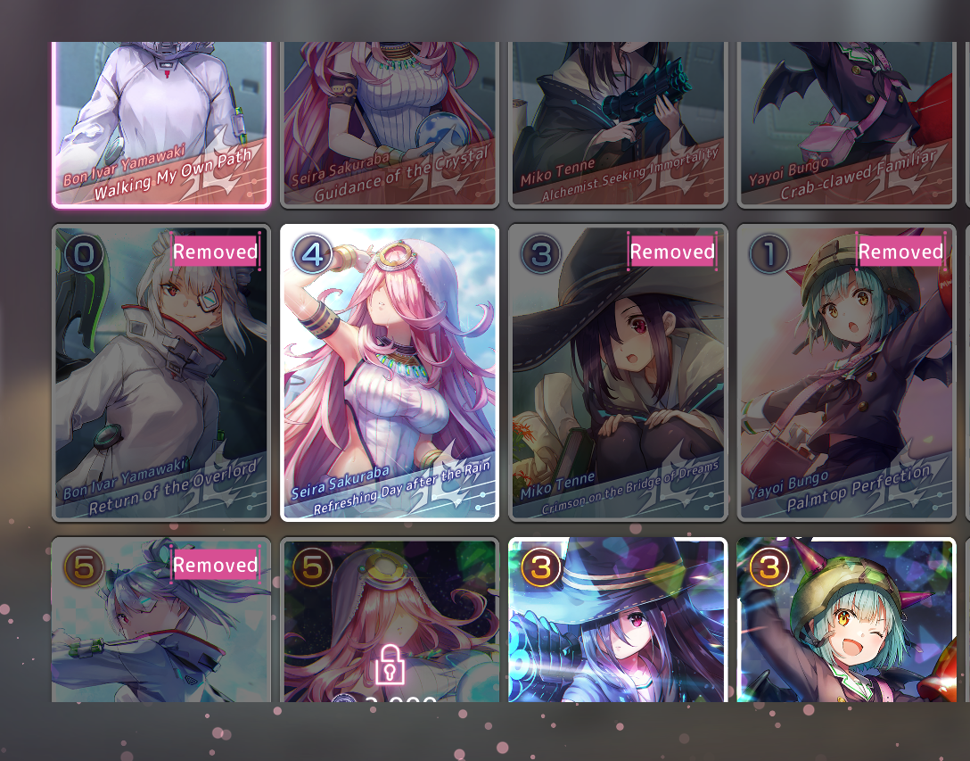 >>5679347 База этого режима это задвоить через карты Цукасы и Тене SS карты Минори, Сумомо и Бунго SS, сделать это желательно в первые два решафла колоды. Далее, набрав девками 150 лвл уже нужно задвоить карту Карен S (НЕ SS). Последний этап это уже карта Карен SS, её задваивать не нужно, использовать когда повер 900+ будет. Моя текущая колода, дошел до 10-й зоны, но не осилил её. Чтобы её осилить нужно набрать 1000 повера и либо дебаффнуть босса картой Мегуми S, либо взять с собой Козуе3. На тот момент у меня её не было, буду пробовать в ближайшее время с ней.