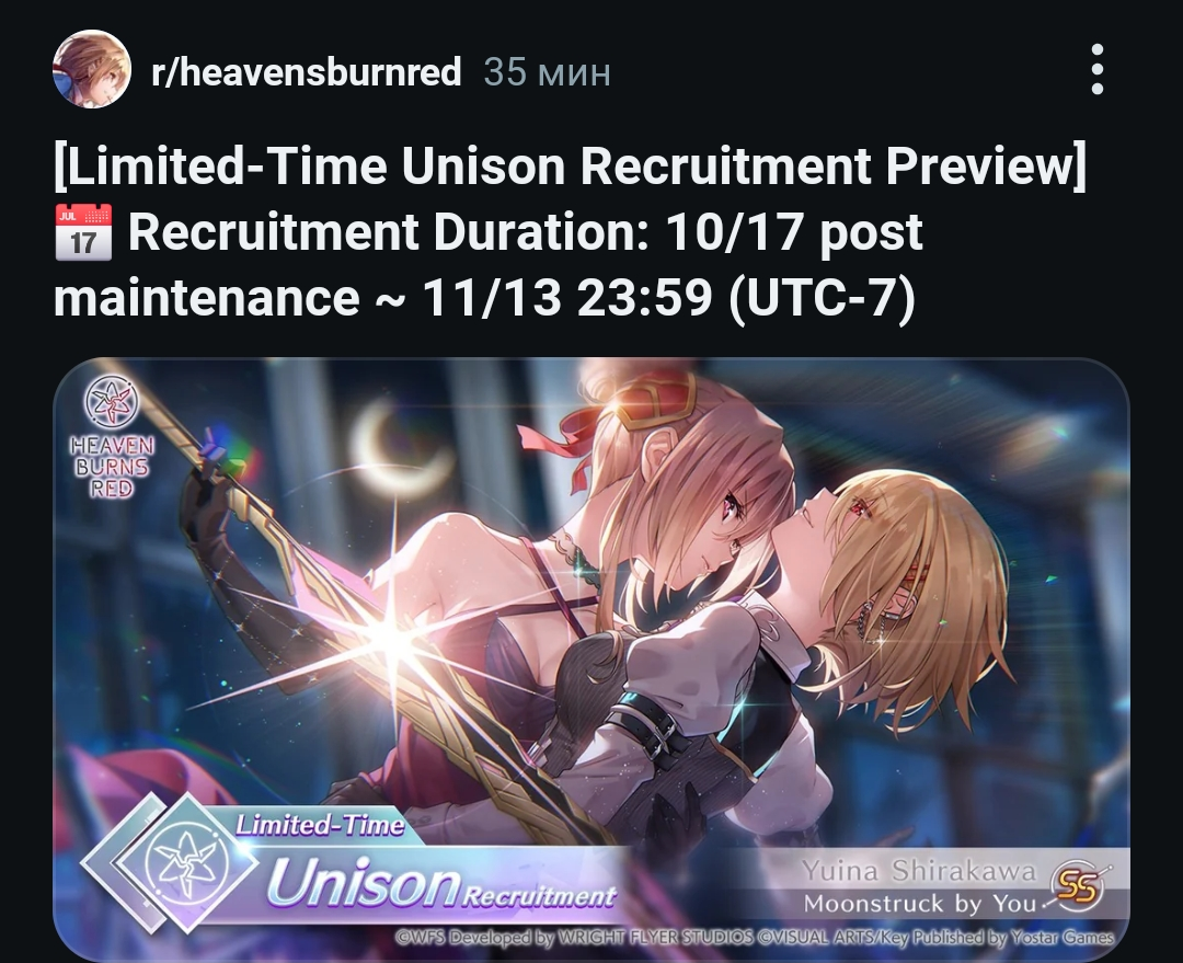 Оказывается под годовщину и коллаб запущен веб-ивент с рулеткой. О нем три дня никто не знал, потому что в официальных новостях его НИКТО НЕ ЗАПОСТИЛ. Интерн-кун, ну ебанарот. https://heavenburnsred.yo-star.com/collab-angelbeats2/ В день можно делать три спина. Может кому-то удастся получить кварц или билетики, мне пока не дропнулось ничего кроме мусорных книг опыта и раковых шкурок.