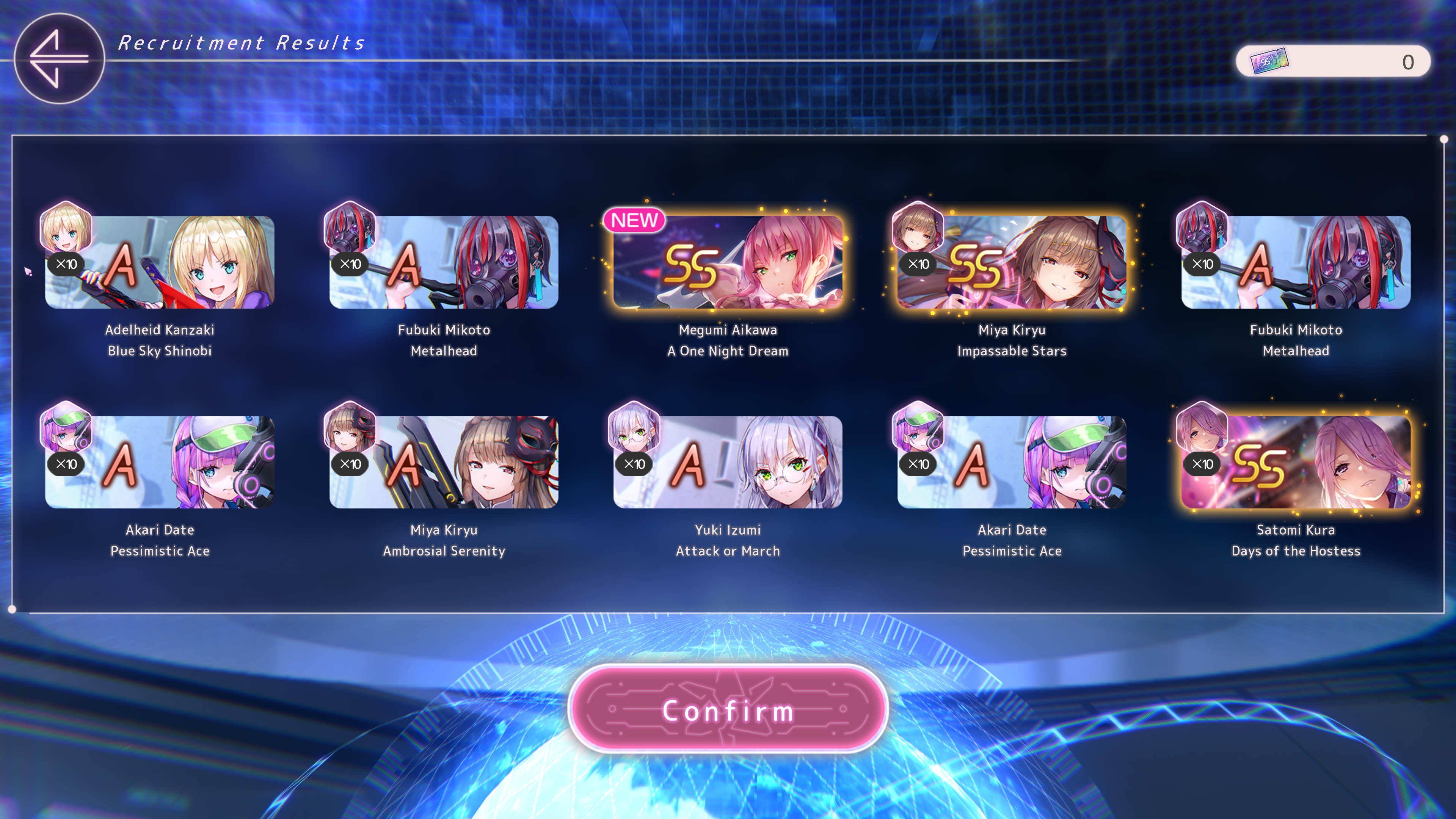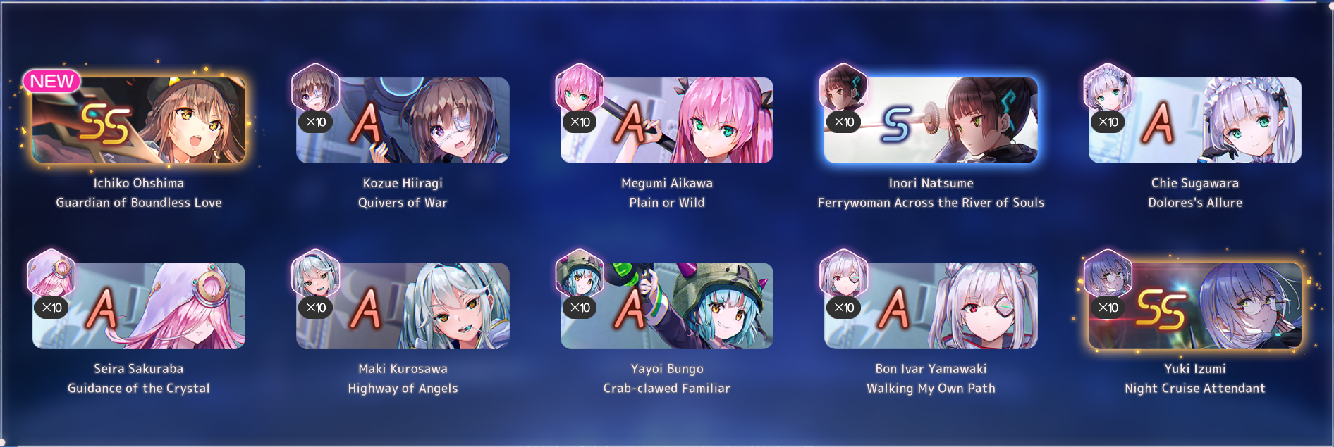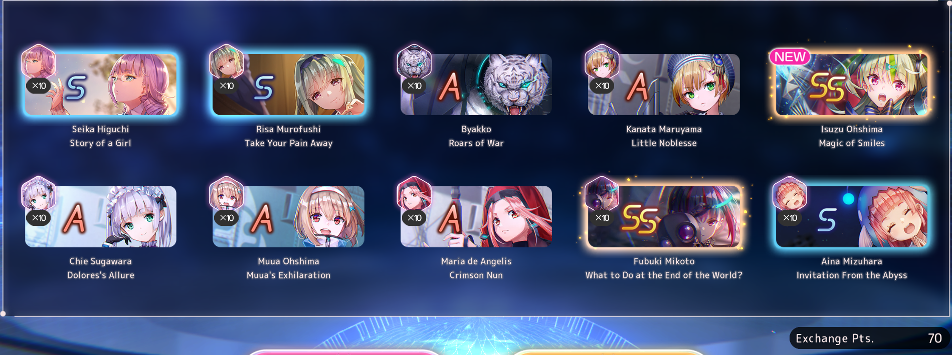 Я на дропы с зеленой гачи вообще не рассчитывал, изначально считал только четыре спарка с билетиков, а дропы взяли и пришли. Я залутал: Сейру; Фубуки; 2хМию; Юйну; Цукасу; Руку; Маки. Словом - неожиданный жир. К спаркам пока не притрагивался, сейчас буду думать, как ими грамотней распорядиться.