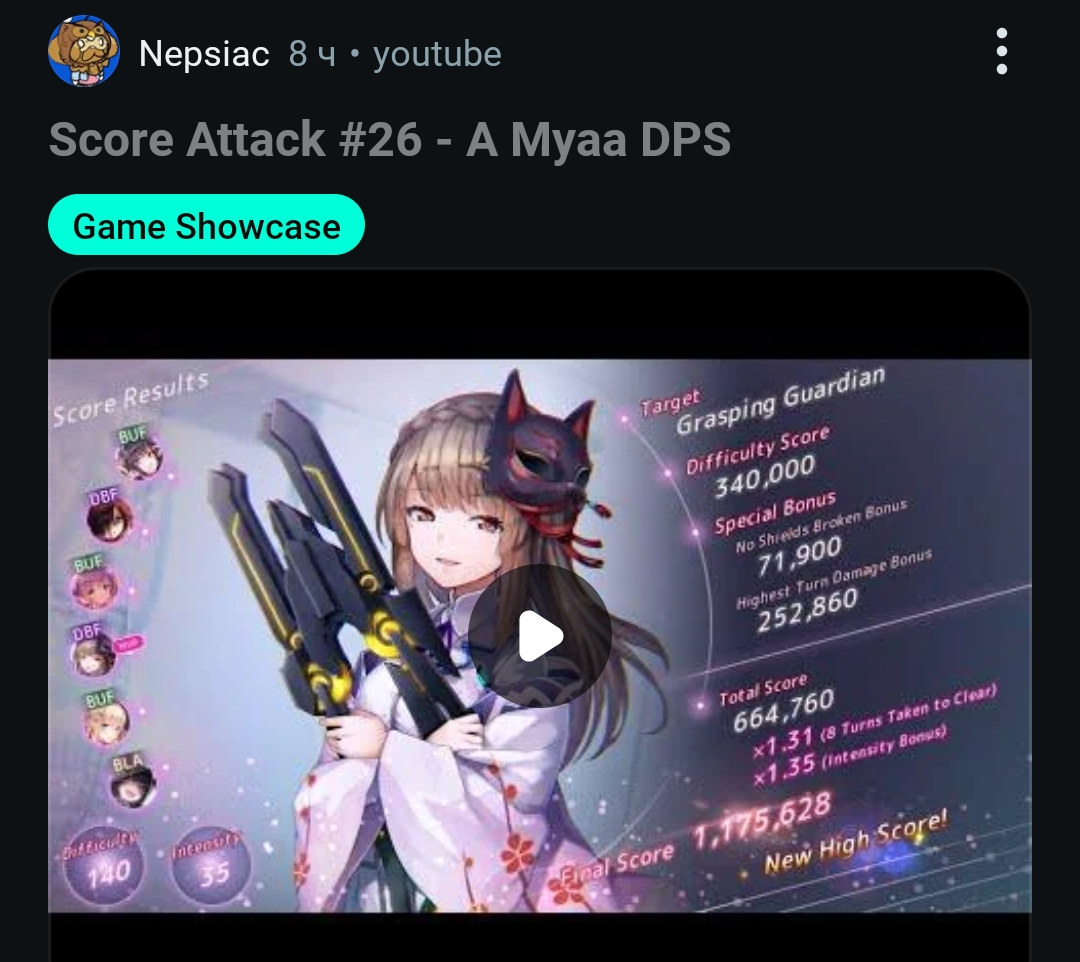 >>5592819 >Попробуй бластера поставить или фреджайл где то добыть. Да это в наличии почти на любой вкус и цвет. Может потом и пробну, но нет уверенности, что без любого дроча получится компенсировать очки от упавших дп полосок. Я больше хочу попробовать повторить проходку чела с реддита. https://www.reddit.com/r/heavensburnred/comments/1nl690z/sa24_3_turns_101mil_with_lb1_inori2/ Но единственного пазла, которого у меня нет - это Карен2, а Карен3 не умеет так ОД залить за 1 ход. Надо тут найти нужный ключик, Акари2 не может снести полоску без залива в нее баффов, а если их залить, то потом на Инори не хватит.