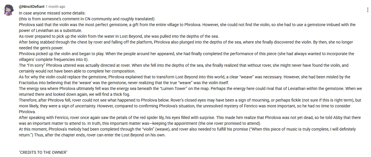 >>5591788 >Потому что Ровер её не забыл. Он и Фулоло не забыл, её мелодия была завершена ею уже в финальной катсцене когда она танцевала на дне, найдя свою оригинальную скрипку, а позже Ровер к ней и пришёл в Lost Beyond как и обещал.