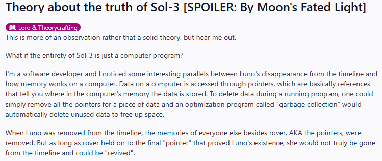>Ряяя, обсуждаете шизов Что поделать, если именно шизики игру-то и обсуждают? Даже жопич набросами провоцирует обсуждение сюжета, не говоря о китай-куне или фроловашизе, которые норм разборы делают. Без них здесь было бы пусто, знай только алтарщик бы клепал свое творчество раз в месяц и все.
