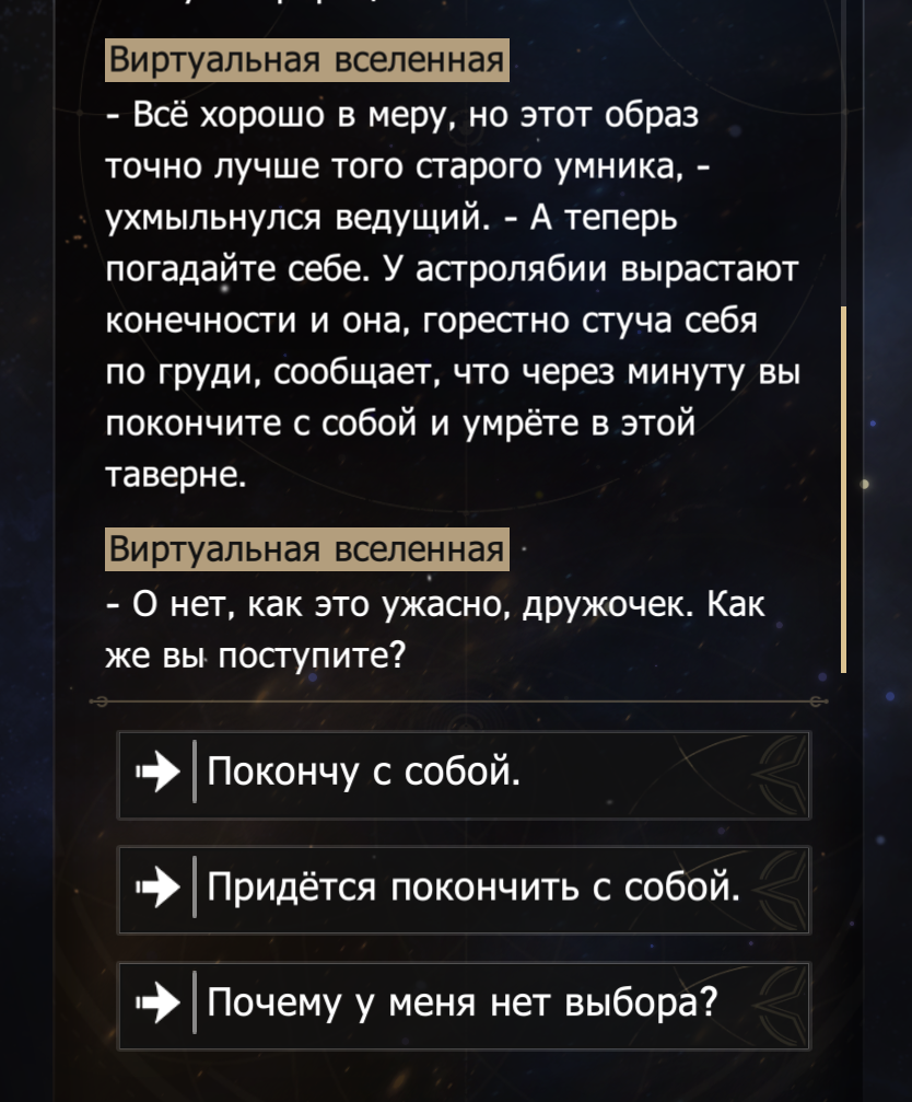 Отсюда же греки не филлер, а часть этого путешествия. Хотя тут кому как, кому-то глобальный лор похуй, а другим греки не зашли. Симуляция изолированная, но происходящие на амфе актуально для всей вселенной из-за Сталесклепа, плюс скорее всего в конце сюжетки амф станет реальной локацией, а не симуляцией или хотя бы греки оттуда смогу вылезти в реальный мир