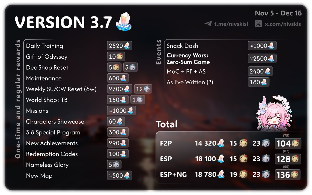 Да и в целом у нас будто сформировавшаяся мета патчей. х.0 - абсолютно всегда лютый скам и наеб гоев (исключением может служить только зеля, но там был релиз игры, сами понимаете) х.1 - Какой-то сильный саппорт на ближайший год х.2 - аниверсари, мейшпуш и все крутки сюда. Все дырки балансятся под этого чарика (на релизе вместо нее была зеля, там календарь съехавше-урезанный из-за первого года, как всегда) х.3-х.4 - второй пуш и всякая отбраковка х.5-х.6 - филлеры и говняк забивать год. Средние балансные чарики, тут можно все скипать - ничего не потеряешь х.7 - Какой-то гнилой сап на старую мету с целью заскамить перед новой планетой - Фуга, Саня, Кирена По этой же причине всем настойчиво советую скипать Калстанцию. А еще есть жучка как исключение из этой меты патчей, но как мы видим первый год в целом был особенный