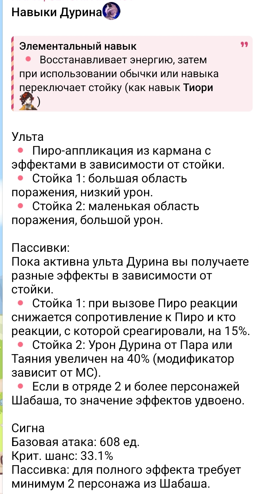 Ascension Passive: While Durin’s Burst is active, his two forms gain the following enhancements. Form 1: When nearby party members trigger Pyro-related reactions, enemies’ Pyro RES and the corresponding elemental RES are reduced by 15%. Form 2: Durin’s Vaporize and Melt DMG is increased by 40% (Elemental Mastery multiplier).
