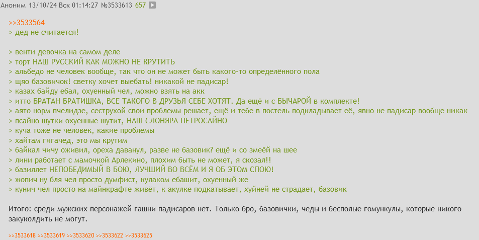 >>5664267 Видел кста опрос на форче по любимому персонажу каждого региона. На всех 1-5 в топ1 были Архонты, и только в Натлане топ1 заняла Ситланя. А Мяв была на 3 месте. Вот и думайте