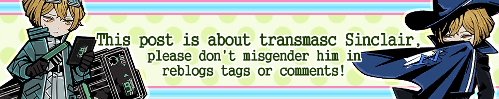 Sinclair is an egg still, but will eventually realise he is bigender and gay (for guys). He is aware of and respects nonbinary people and ppl who use other pronouns like Dante but subconsiously thinks that you need to have like, qualifications to be allowed identify as trans and it's not something that just anyone is allowed to do. He still hasn't accepted that he likes boys OR that he's not into girls. Give him some time, poor kid has catholic guilt in a setting with no catholics, he thinks every little thing he does is sinful, nevermind the stuff that other people actually say is a sin. He thinks its fine and is supportive when others are queer but not when he is.