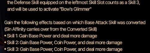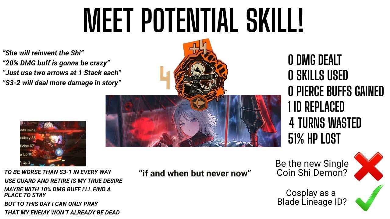 S1 получает 4 пк и 4 бк S2 генерит только 4 пп и 4 бп S3 +4 CP вместо +3, 4пк, 4бк, 4пп, 4бп, +CP кондиш на 50% S3-2 убрать пп и пк, уничтожает монеты противникараунды прицеливания если скилл не !! или !!!, +4sp за каждую сломанную монету Guard 4пк или 4пп на чёт нечёт раундах, +4 sp Liferender сделать перманентным Воткнутая стрела убрать бп, 0.5бкстак (окрвверх) [on skill use], +1 фрагила на 4ой стреле Пассивка снайпер лучник во время прицеливания заменяет нижний слот самым слабым доступным скиллом и верхний слот любым первым доступным S2 или S3, всё это при помощи перестановки текущих слотов в полоске и в гаранте что приходящий скилл на след ход будет самым слабым из доступных в ротации за 2 цикла, при s3 s3-2 +хз сколько фп и CP(не помню цифры) чтобы под полными кондишами было 40+40, при s2 20+20