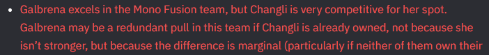 >>5701165 Огнепачка идеально вписана друг в друга, поэтому до сих пор сильная. У Галбрены просто цифры большие и та же стихия. Её идеальной пачки в-общем то не существует пока, как это было у Чанли в 1.х. На тех же кораблях Чангли точно сильнее Галбрены в той же пачке, в башне Габрена цифрами давит.