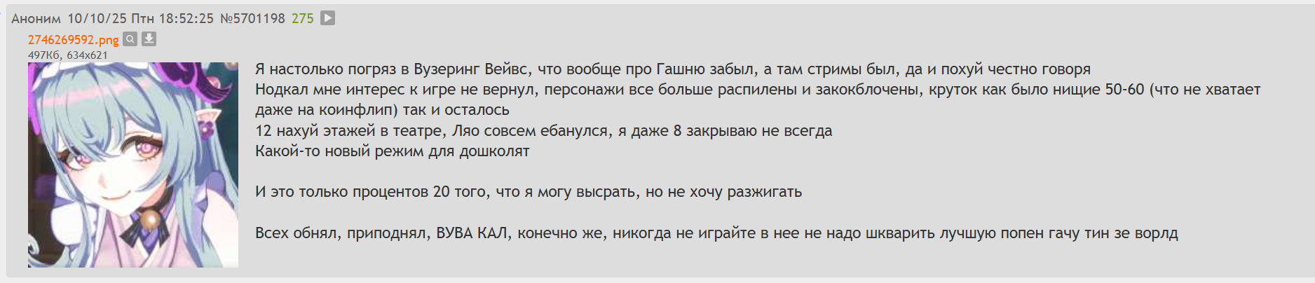 Я настолько погряз в Геншин Импакт, что вообще про Вуву забыл, а там патчи был, да и похуй честно говоря Срептимонт мне интерес к игре не вернул, персонажи все больше распилены и закокблочены, круток как было нищие 50-60 (что не хватает даже на коинфлип) так и осталось 4 нахуй этажей по центру в башне, Писевор совсем ебанулся, я даже 2 закрываю не всегда Какой-то вампир сурвайвол для дошколят