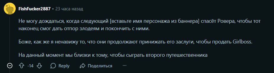 Малые, я тут понял, что галбрена - это же буквально ровер, только лучше его во всем. Следите за руками: - они оба путешествуют по миру, борясь с ламентом, только у нее уже куча фрагов, сделанных в соло, а ровер кое-как вывозит с помощью кучи подсосов - они оба оставили свою прошлую жизнь позади, но если галя сделала из-за трагедии, которая сделала ее опасной для окружающих, то ровер просто словил грусняшку и вайпнул себе память, после убежал как омежка - у них обоих есть компаньон, но если у галбрена это крутой тд со своими собственными взглядами и философией и у них действительно интересные и сложные отношения, то у ровера - это мохнатая прожорливая паймон, о которой он ничего не знает и потому отношений кроме как "мы едим вместе" у них нет - они оба превозмогают, но если галя превозмогает собственное проклятие, покорив его и обратив себе на службу, то ровер превозмогает собственную амнезию, которую он по своей тупости сделал сам Галя - это типичный антигерой с тяжелой судьбой, золотым сердцем и крутым дизайном, еще и с чувством юмора. Ровер - это типичный гг гач, с унылым дизайном, просто плывущий по течению, шутить не умеет. Короче говоря, я считаю, что Писевору нужно сделать ее главным героем вувы, от этого все только выиграют. Нужно составить петицию и написать всем тредом, что думаете?