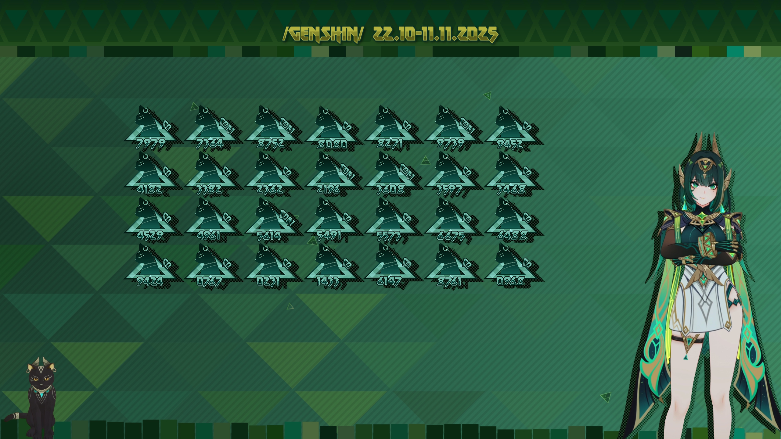продолжаем предзапись на алтарь Нефер правила записи: 4 последние цифры UID + количество конст и опционально сигна с рефайнами 0000 С0 - без сигны и конст, C0R0 = С0 0000 C0R1 - без конст с сигной без рефайнов С0-С6 - количество конст, R1-R5 - количество рефайнов видеоверсия: >>5705992 → финальная видеоверсия будет на следующий день после окончания баннера зачем записываться, какой смысл? - это традиция треда предзапись на удачу и запись постфактум на память в архив алтарей (архив в шапке - FAQ и архив треда -> Архив треда: https://rentry.co/genarch ) если кого то пропустил или есть ошибки пишите