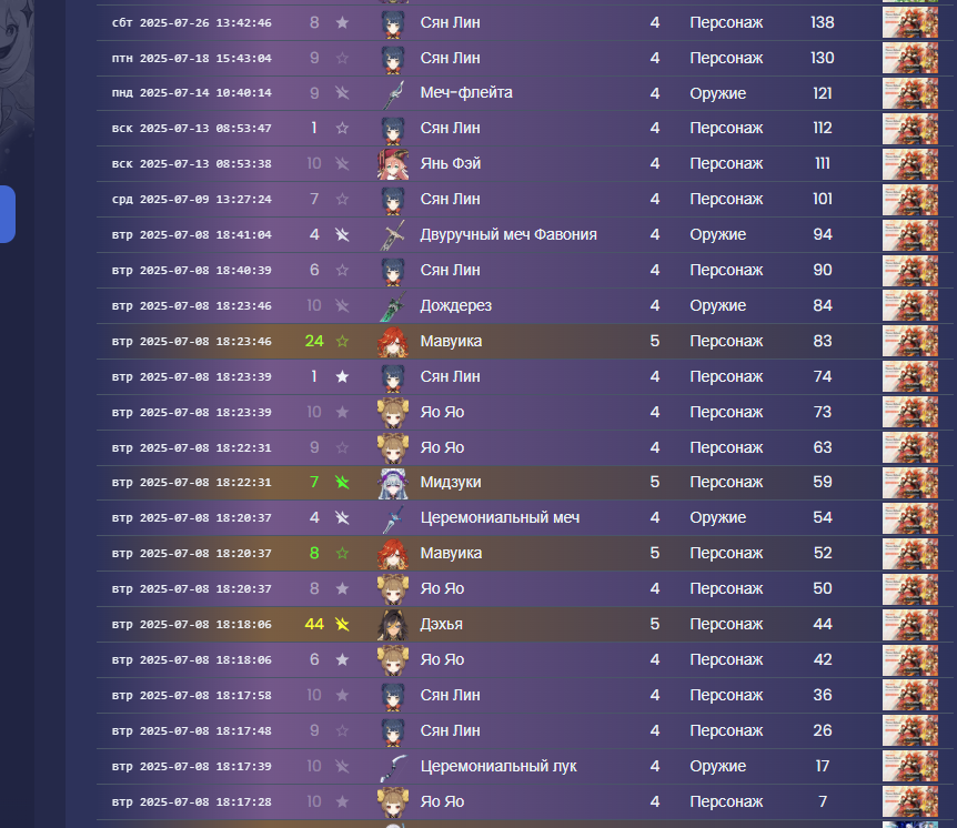 Тяжело врываться после долгого перерыва, надо качать сразу кучу новых персонажей. Не хватает смолы, не хватает книжек. Артефакты ели-ели падают. Завтра аванс будет куплю себе луну и бп, с бп лутану книжек на ап одно из чемпиков до 90 лвл хватит. По порядку буду Шилонен, Кирилла и Елань апать. Следующим моим чемпиком будет Фурина и потом Арлекино.