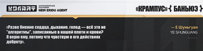 >Её не просто так заанонсили прям вместе с Крампусом в одном тизере. Это не был тизер Крампуса, это был тизер сюжета. Фракцию Крампуса в тизере действительно показали, но там они стоят втроём, без Шуньгуан. В этом же тизере показали и Йидхари с Люсией, но ты ведь их в Крампус не записываешь? И таки да, Шуньгуан показывают только в самом конце, отдельно от всех. Судя по тому, что Шуньгуан выходит не в следующей версии (которой тизер посвящён), а только, надо полагать, в 2.5 — это заблаговременный прогрев на войдхантера.