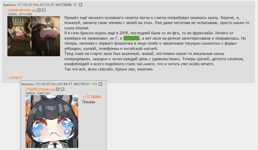 Прошёл ещё немного основного сюжета патча и слегка попробовал занюхать калзу. Короче, я, пожалуй, закончу свою эпопею с зюзей на этом. Уже даже негатива не испытываю, просто какая-то скука ебаная. Я в гачи бросил играть ещё в 2018, последней была то ли фго, то ли фронтлайн. Ничего от хуевёрса не занюхивал, ни Г, и Женовоз, а вот зюзя на релизе заинтересовала и понравилась. Но теперь, начиная с первого флажочка в лице сенби и заканчивая текущим моментом с фурри-уёбищем, калзой, телефоном и китайской магией. Тред тоже на старте зюзи был ахуенный, живой, постоянно какие-то локальные мемы генерировали, заходил и читал каждый день с удовольствием. Теперь срачей, детекта семёнов, конфоблядей и всего подобного стало так много, что и читать уже особо нечего. Так что всё, всем спасибо. Кроме ляо, конечно.